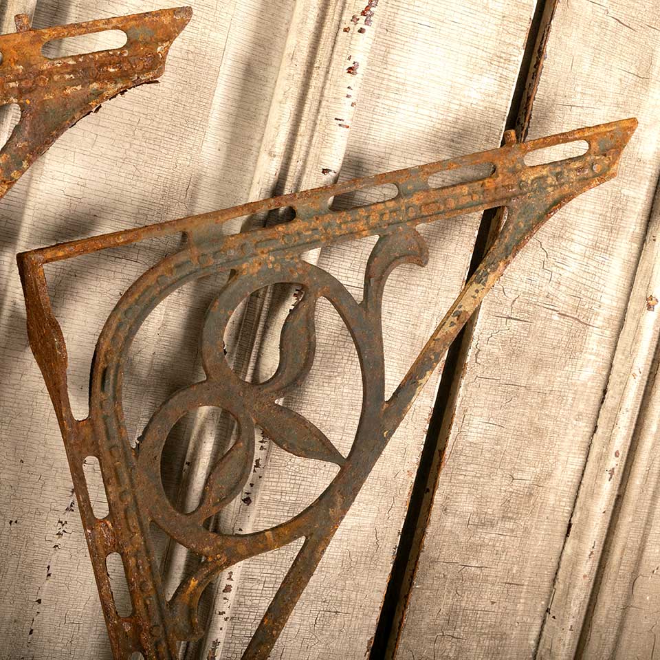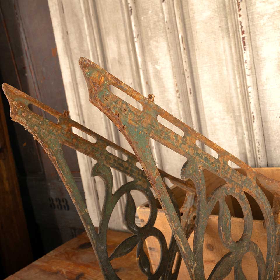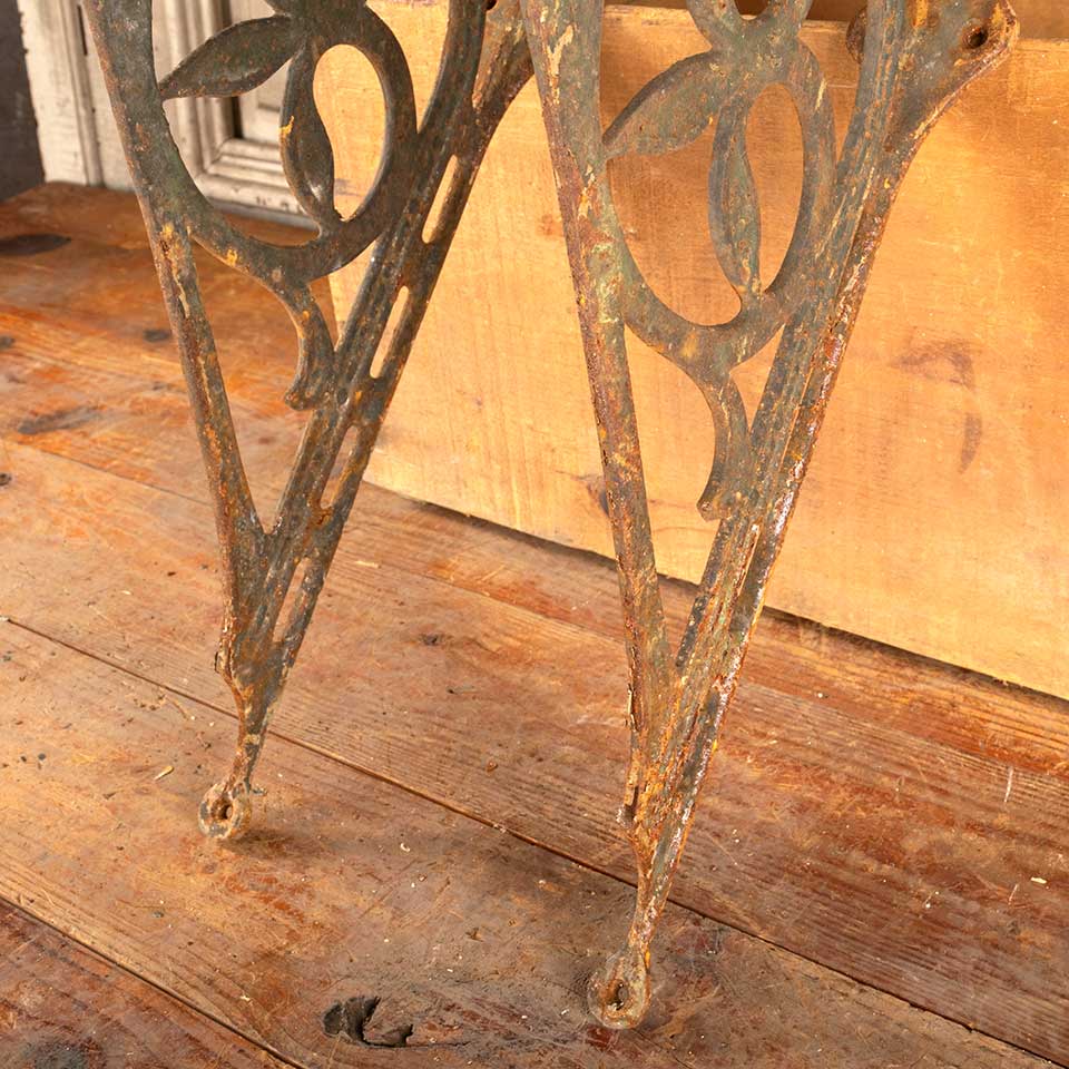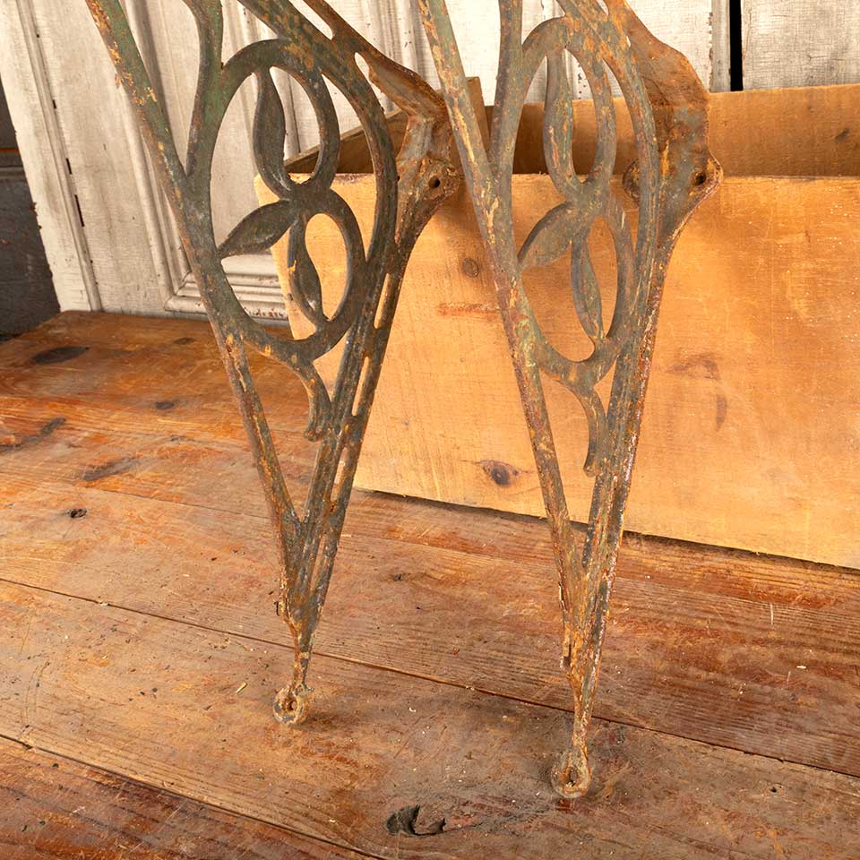 Pair of architectural salvage antique cast iron bathroom marble top sink brackets each measuring approx. 2 3/8" wide (widest point) x 16" tall x 15 7/8" front to back. See photos to evaluate condition. Priced at $275 for the pair.