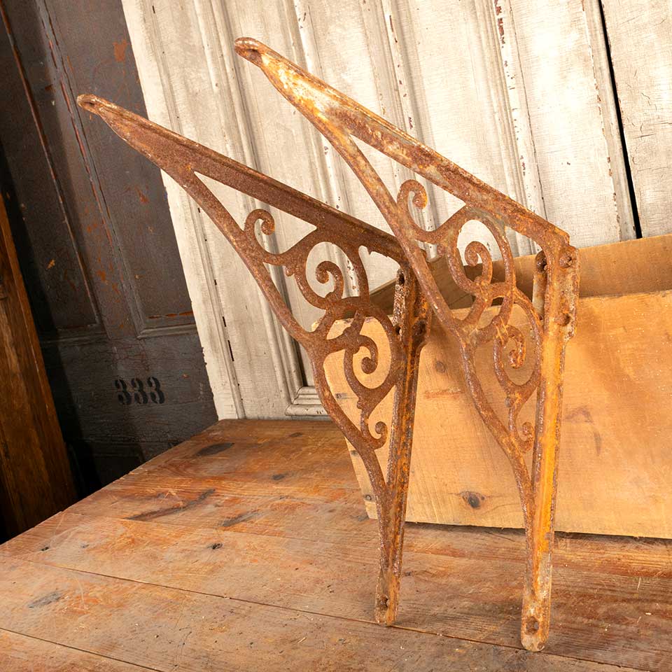 Pair of architectural salvage antique cast iron bathroom marble top sink brackets each measuring approx. 2" wide (widest point) x 15 3/4" tall x 17 3/4" front to back. See photos to evaluate condition. Priced at $275 for the pair.
