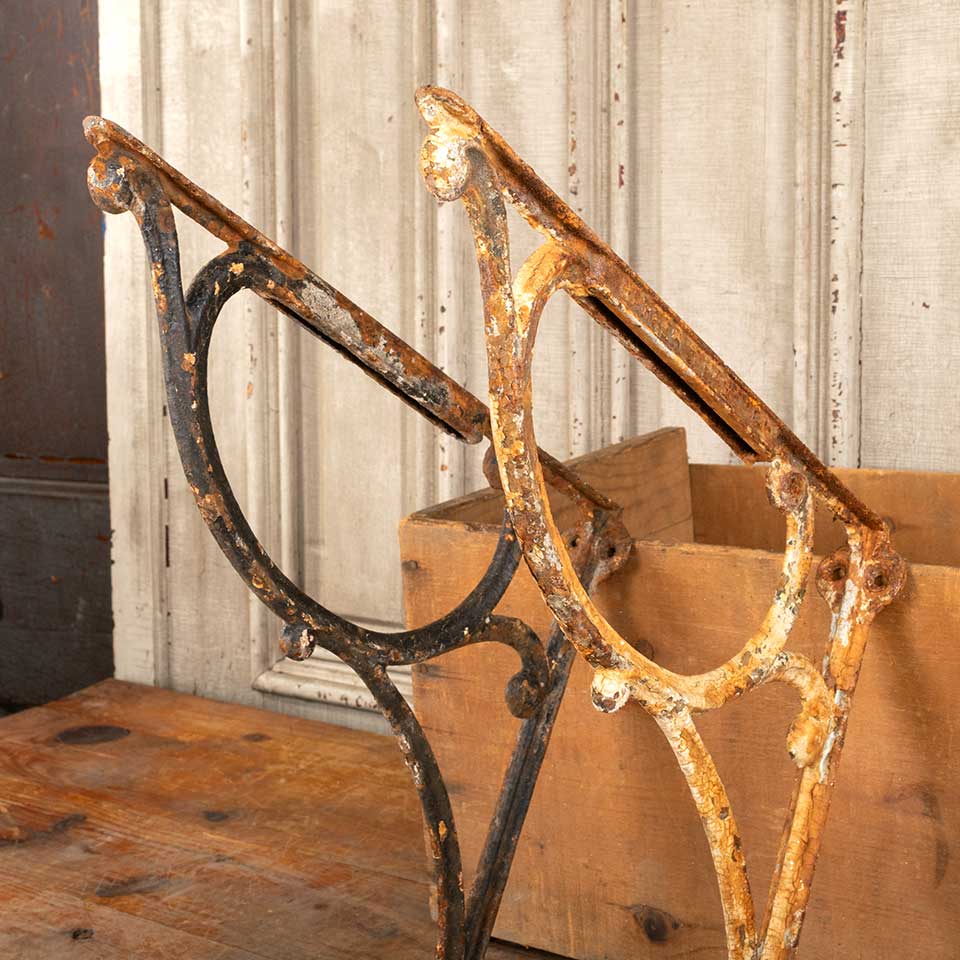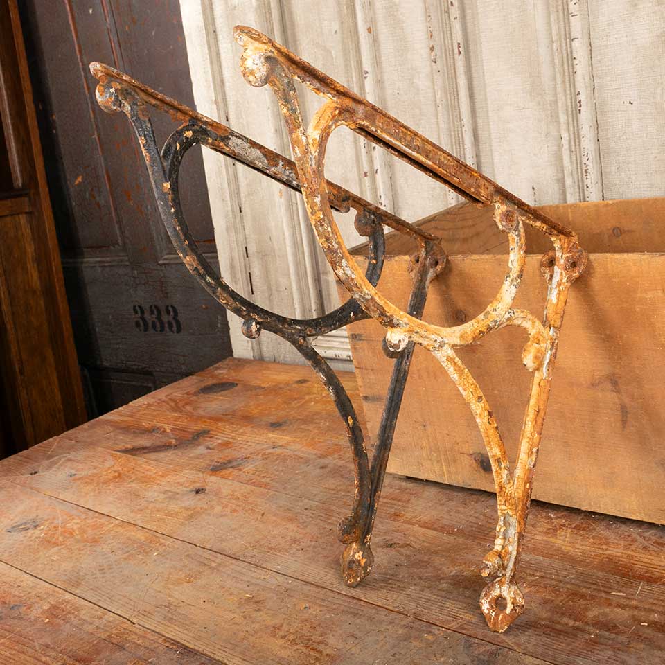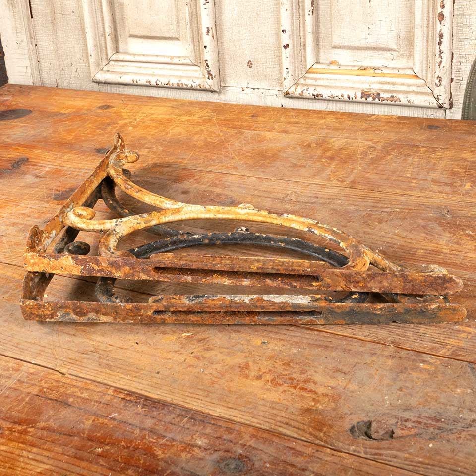 Pair of architectural salvage antique cast iron bathroom marble top sink brackets each measuring approx. 1 7/8" wide (widest point) x 14" tall x 15 3/4" front to back. See photos to evaluate condition. Priced at $150 for the pair.