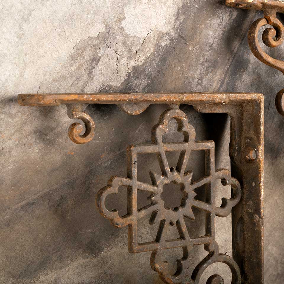 Pair of architectural salvage antique ornate cast iron shelf brackets each measuring approx. 7/8" wide (widest point) x 7" tall x 5" front to back. Damage to both brackets, see photos to evaluate condition. Priced at $45 for the pair.