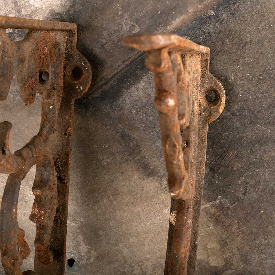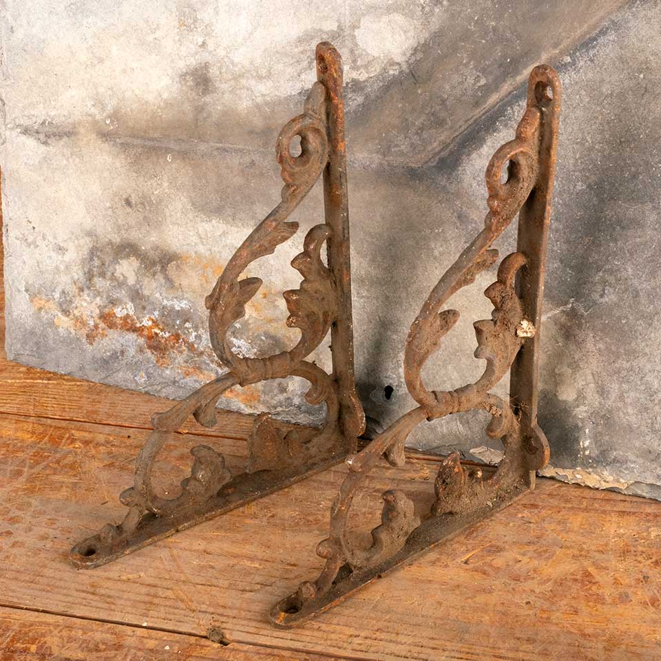 Pair of architectural salvage antique ornate cast iron shelf brackets each measuring approx. 1 3/8" wide (widest point) x 8 3/8" tall x 5 3/4" front to back. One bracket is bent, see photos to evaluate condition. Priced at $50 for the pair.