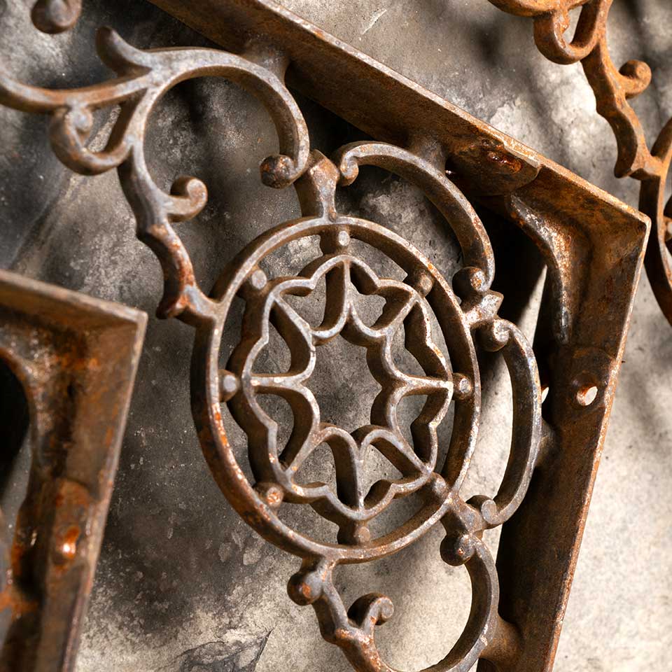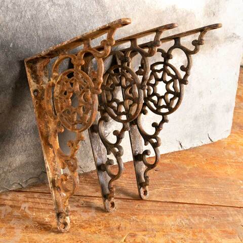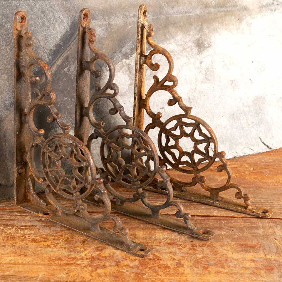 Set of three architectural salvage antique ornate cast iron shelf brackets each measuring approx. 1" wide (widest point) x 6 3/4" tall x 5 1/4" front to back. See photos to evaluate condition. Priced at $125 for the set.