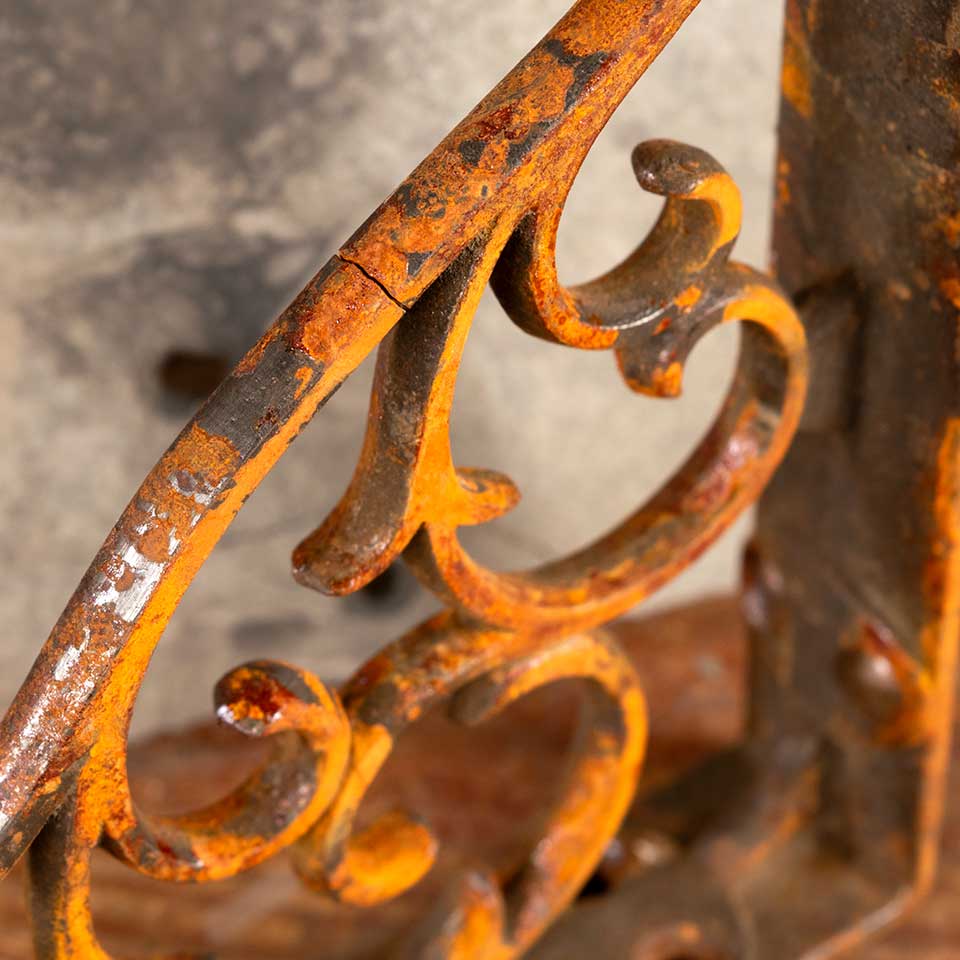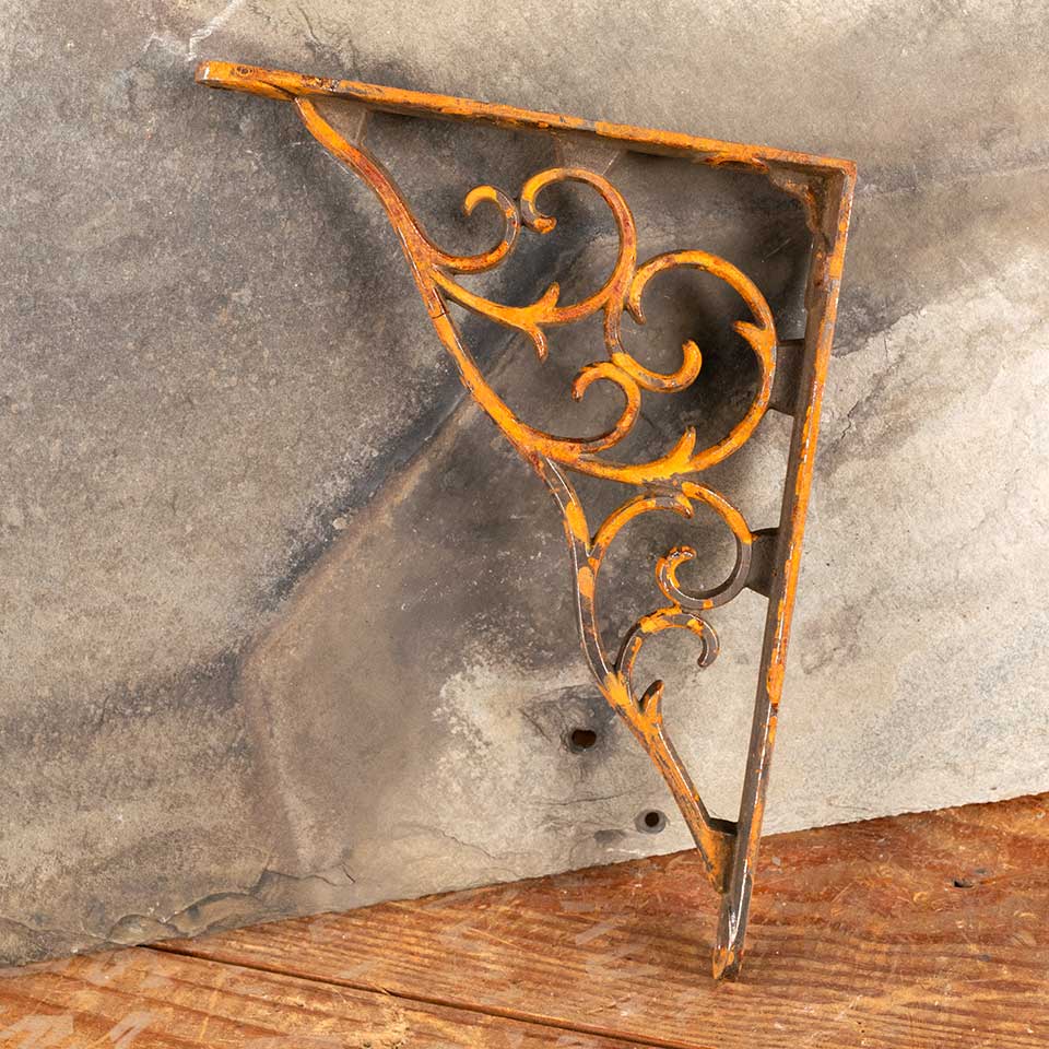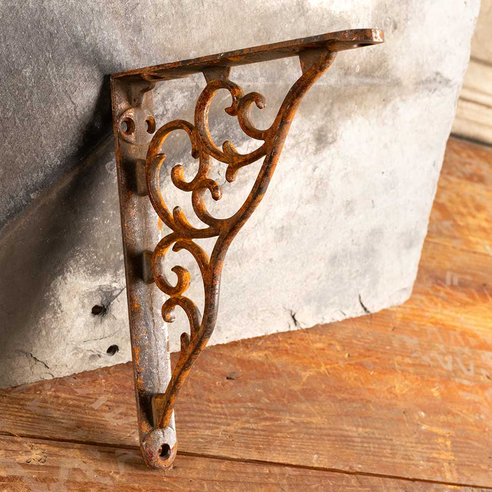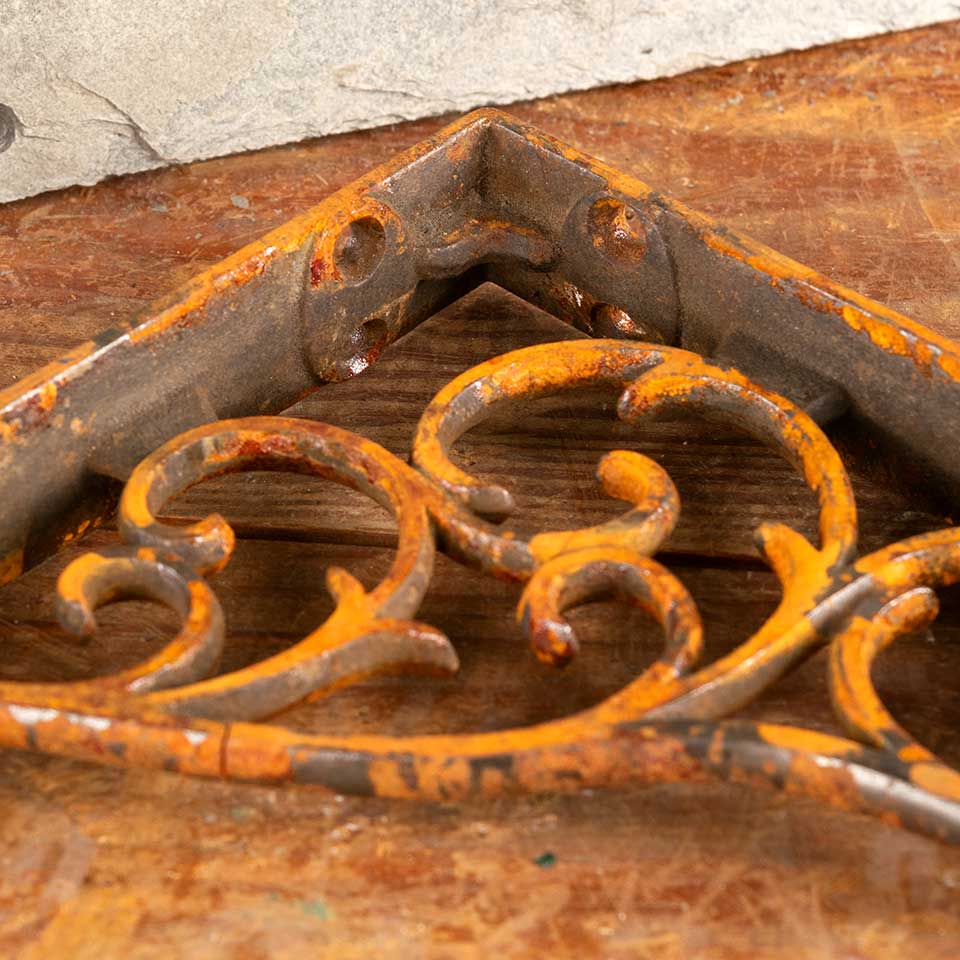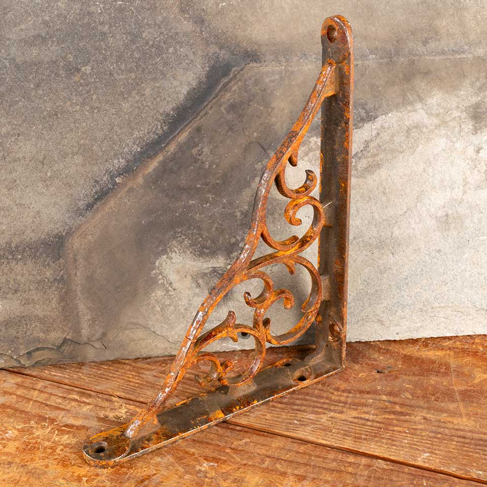 Architectural salvage antique ornate cast iron shelf bracket measuring approx. 7/8" wide (widest point) x 7 1/4" tall x 5 1/2" front to back. There is a crack in the bracket. See photos to evaluate condition.