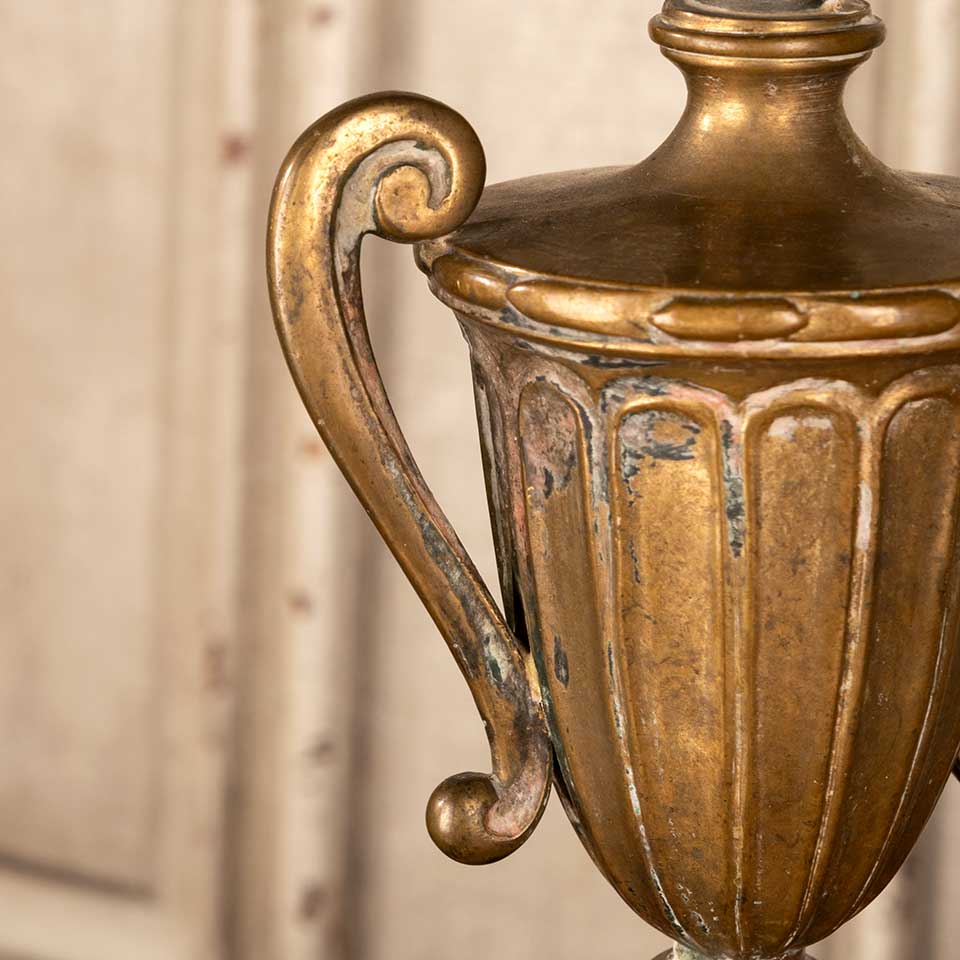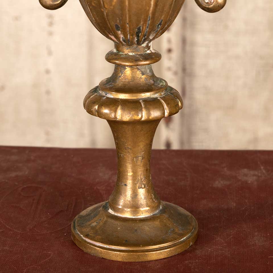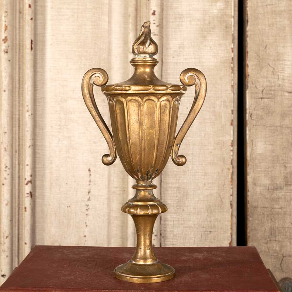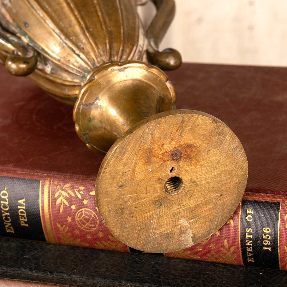 Architectural salvage antique solid cast brass finial measuring approx. 4" in diameter x 8 1/4" tall x 2 3/4" front to back with a 2" diameter base. See photos to evaluate condition.
