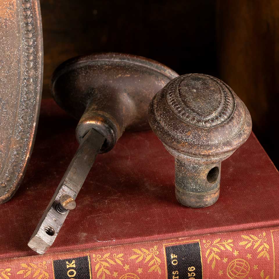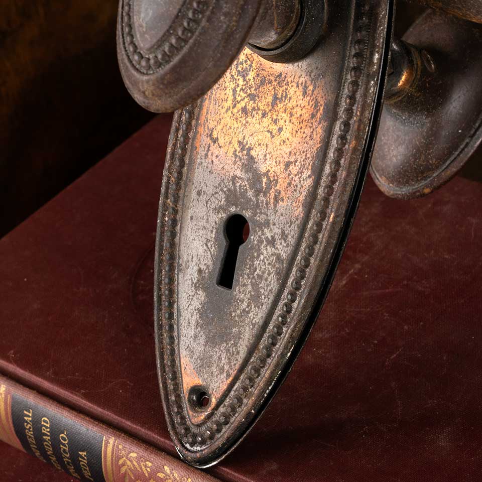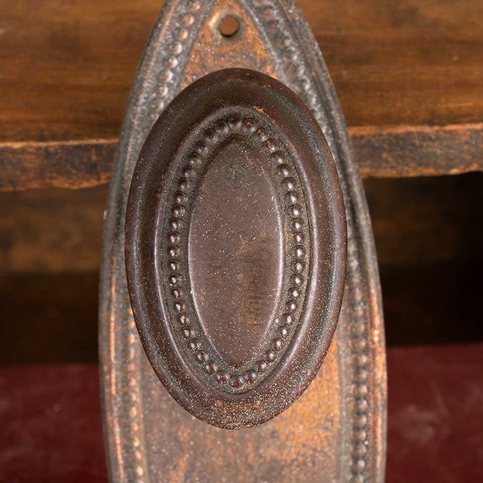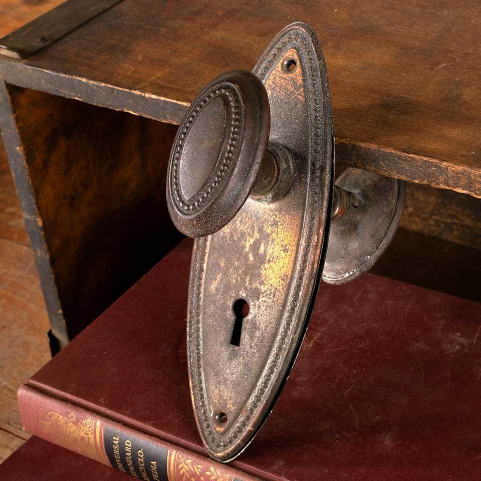 Architectural salvage antique interior door hardware set including a pair of oval shaped doorknobs (1 1/2" x 2 1/2") with tapped spindle and set screws and pair of backplates with a beaded border, keyholes, and a worn Japanned finish (2 1/4" x 7"). Spindle hole and keyholes measure 2 1/2" on centers. Color and condition vary, see photos to evaluate. Priced at $125/ set.