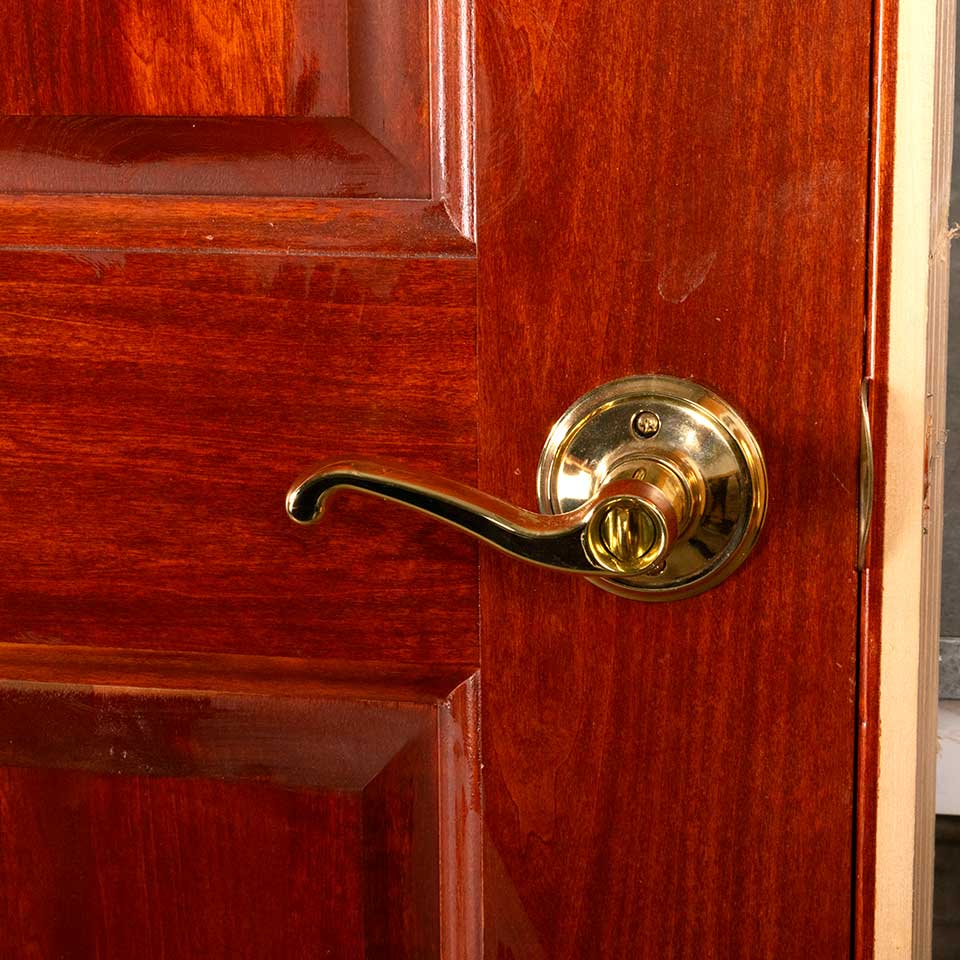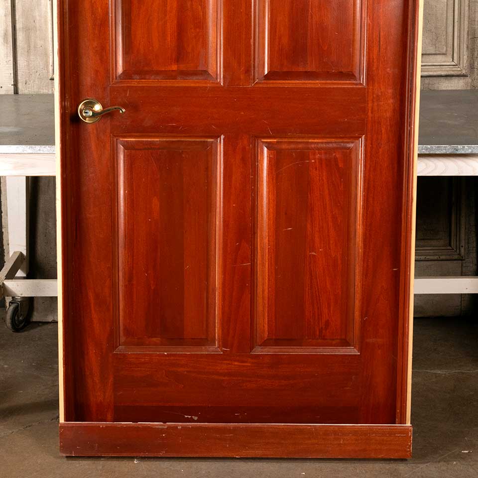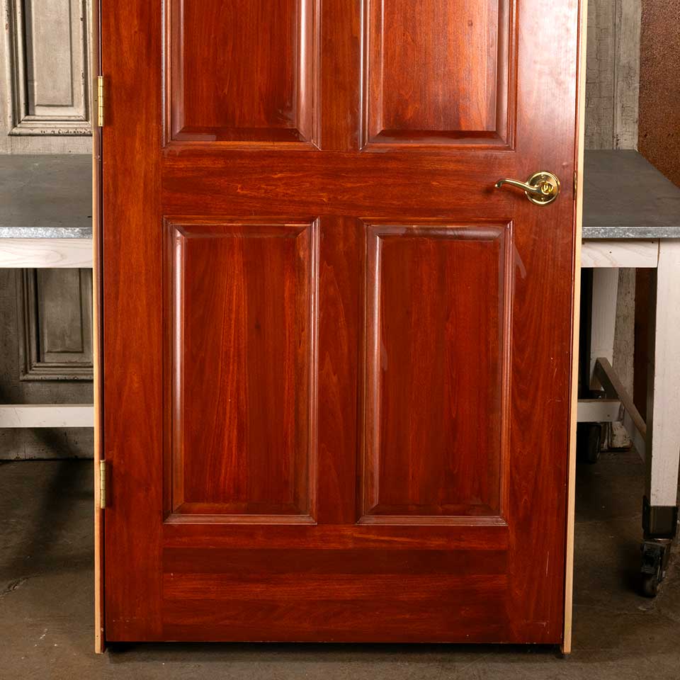 Architectural salvage pre-hung four panel wood interior right handed door with hardware and jamb measuring approx. 36" wide x 80" tall x 1 1/8" thick (door dimensions) and 37 5/8" wide x 81 3/4" tall x 4 3/4" front to back (jamb dimensions). This is not an antique door. Color and condition may vary, see photos to evaluate. Priced at $500/each.