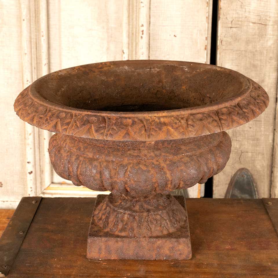 Architectural salvage rusty cast iron garden planter urn measuring approx. 11" in diameter x 7 1/2" tall with a 4 1/2" square base. Color and condition may vary, see photos to evaluate. Priced at $195/each.