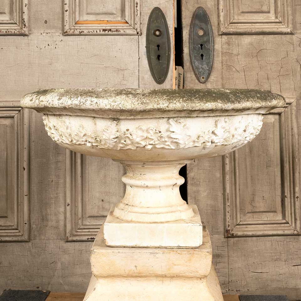 Architectural salvage wide mouth cast concrete garden urn planter (approx. 22" in diameter x 12 1/2" tall with an 8" square base) and pedestal base (approx. 9" tall with a 12" square base and a 10" square top). The base is marked 1990 Henri Studio INC. Wauconda 8810. See photos to evaluate condition. Priced at $450 for the two piece set.