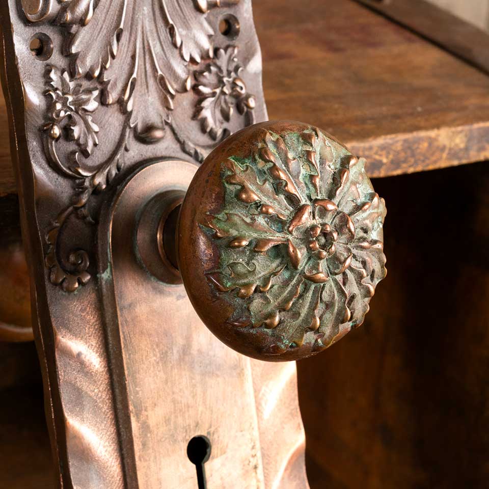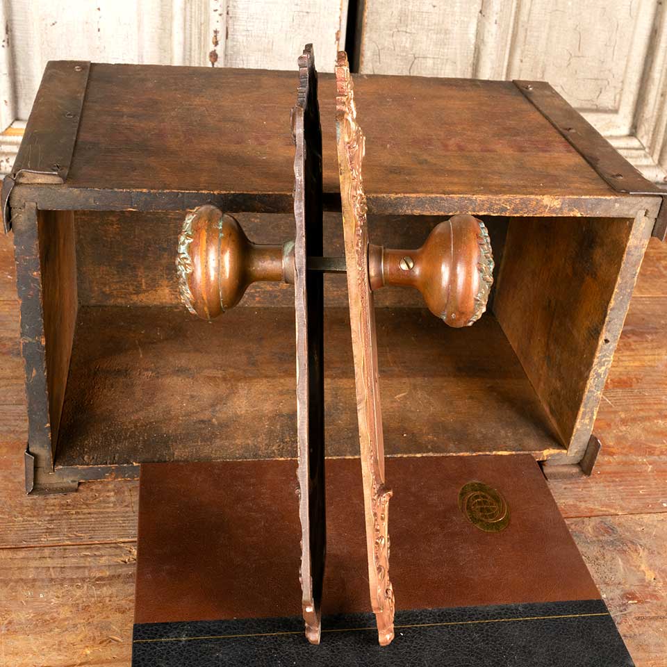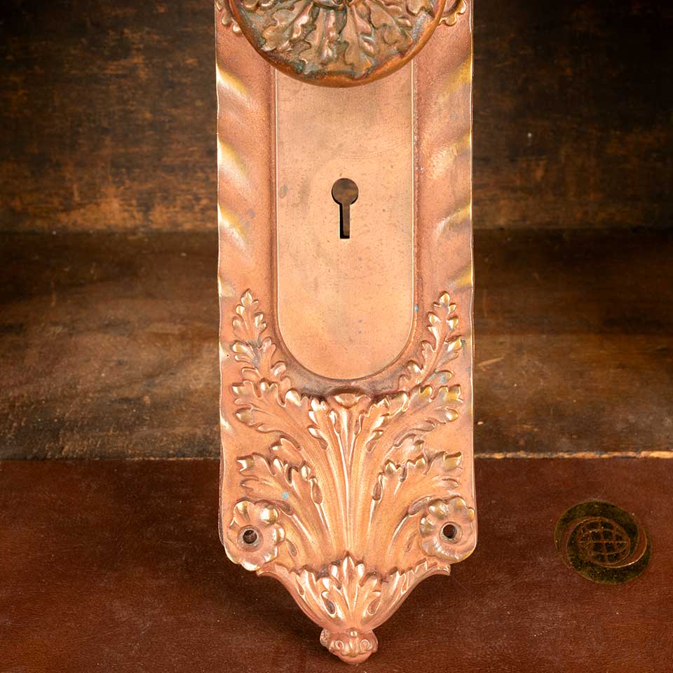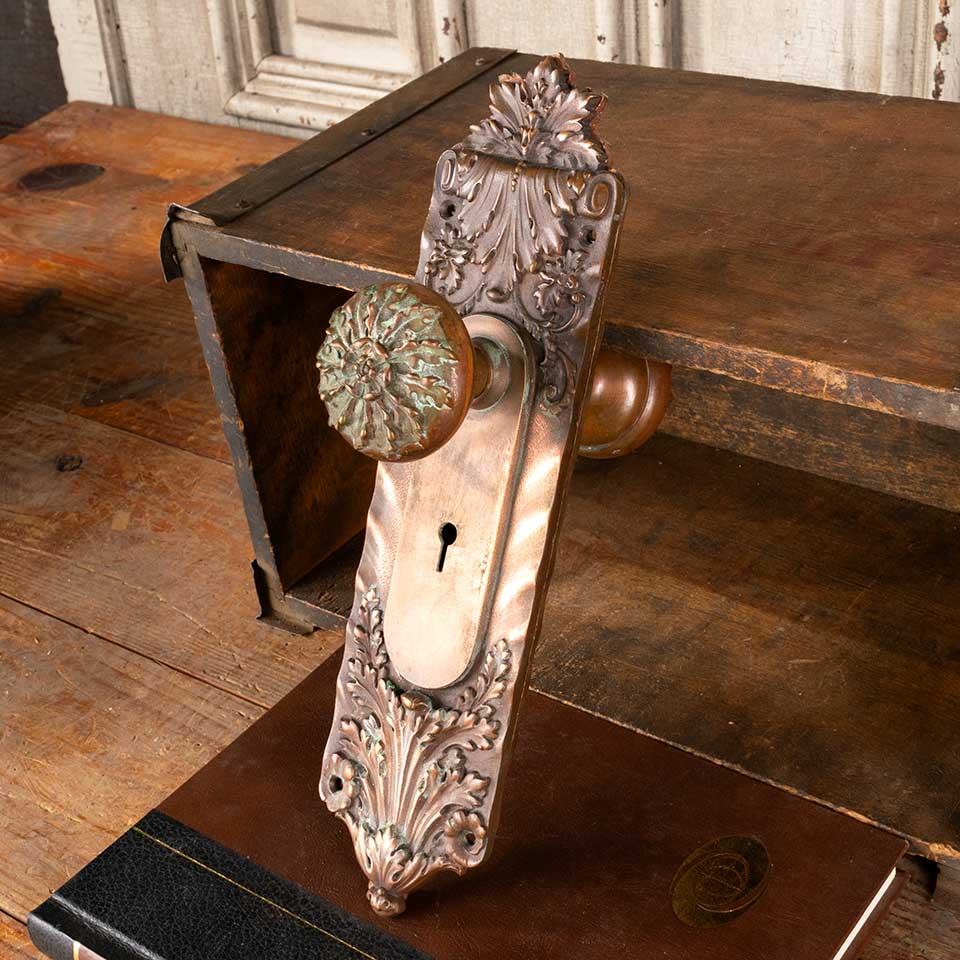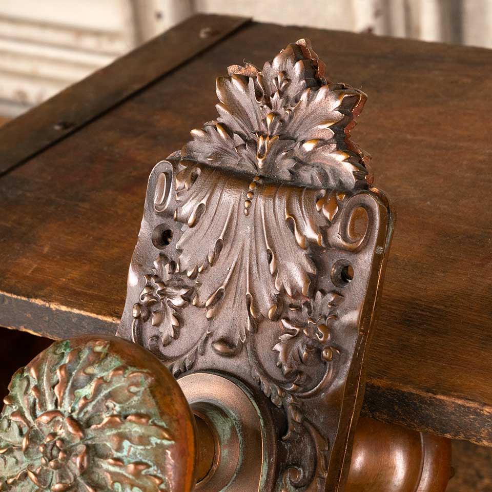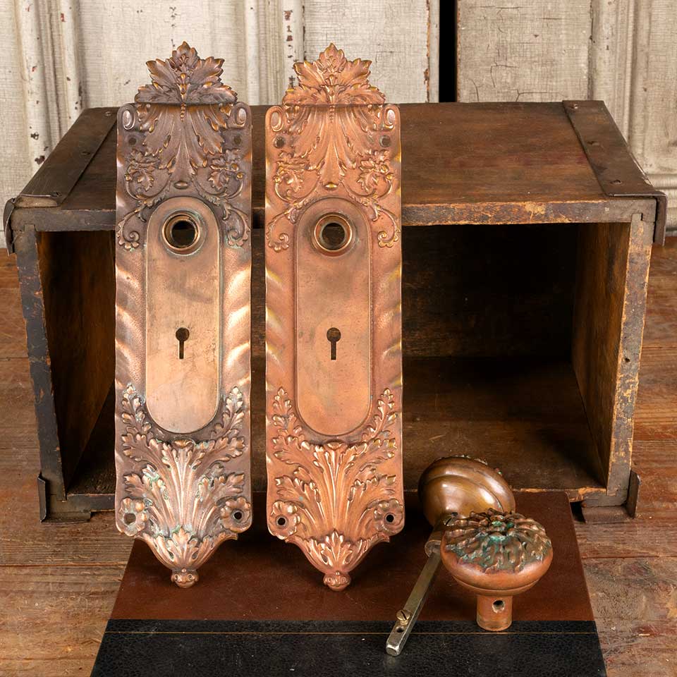 Architectural salvage antique Russell & Erwin Manufacturing Company Verocchio pattern c.1896 entry door hardware set. The set includes a pair of ornate bronze doorknobs (2 1/4" in diameter), a tapped spindle with set screws, and two cast bronze backplates (3" wide x 11 3/4" tall x 1/8" front to back). See photos to evaluate condition. Priced at $750 for the set.