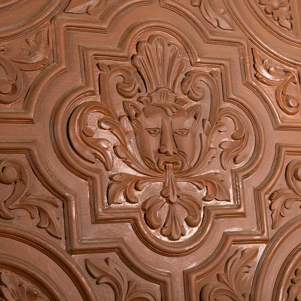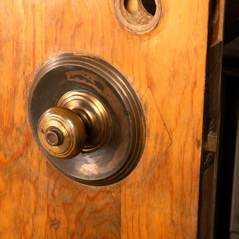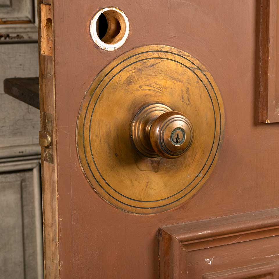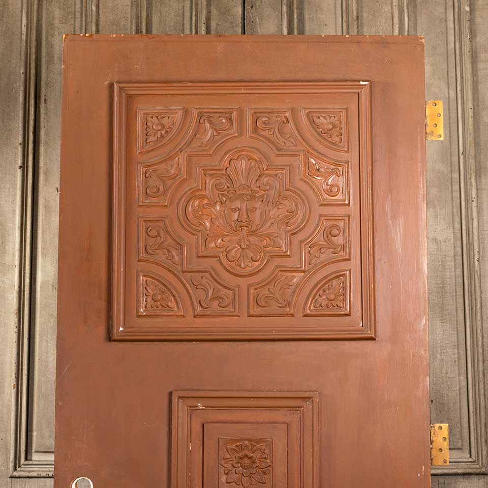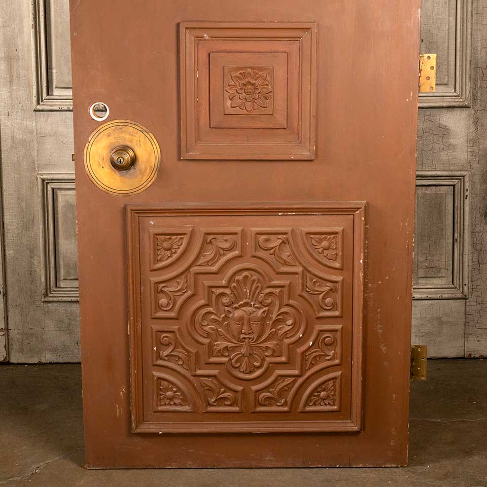 Architectural salvage vintage wood entry door with carved wood panels and hardware measuring approx. 35 1/2" wide x 82 3/4" tall x 1 3/4" thick. The door is painted on the exterior and natural on the interior. See photos to evaluate condition. Priced at $1,750 for the door and hardware.