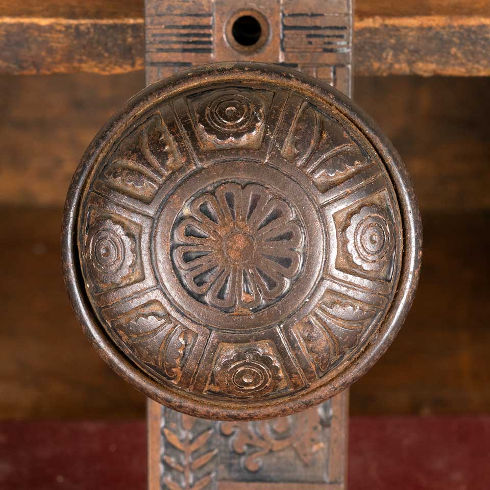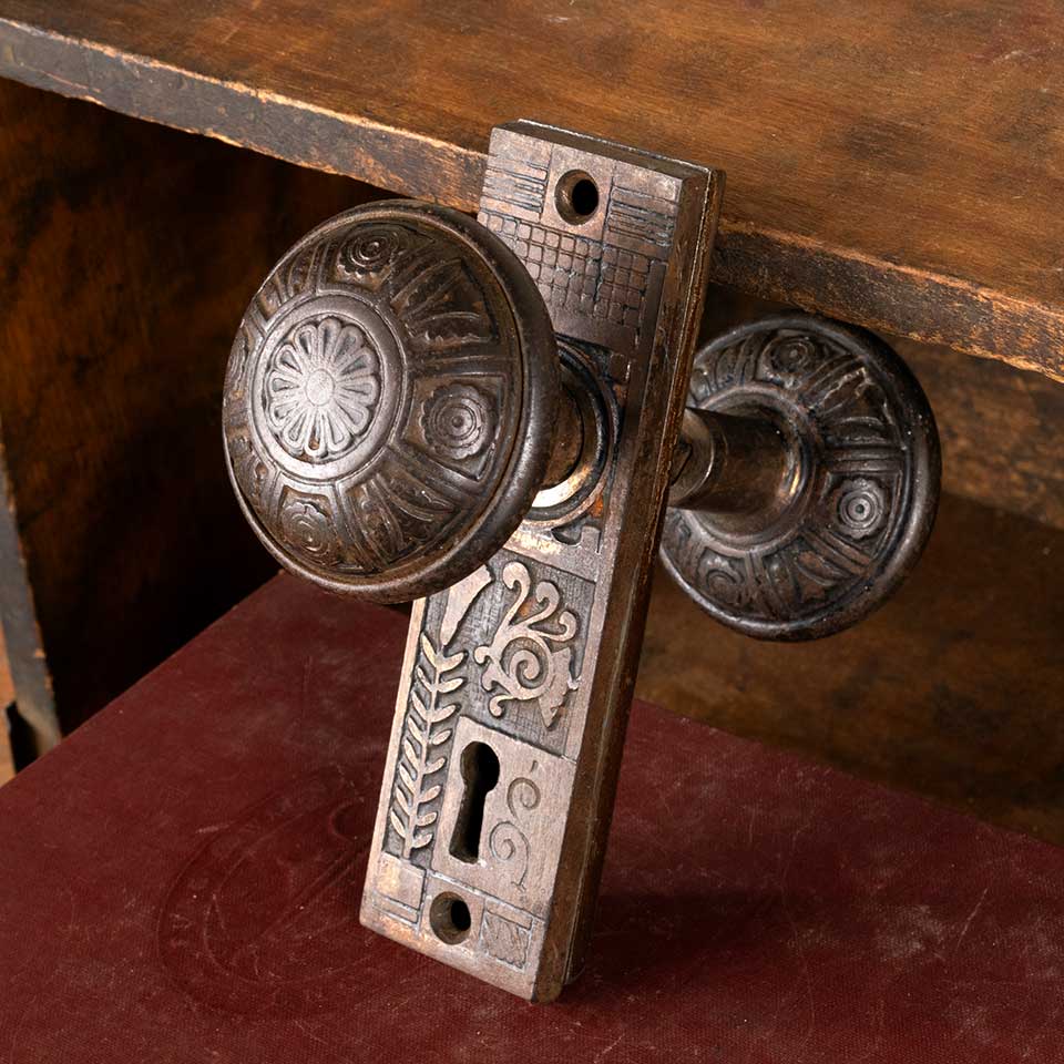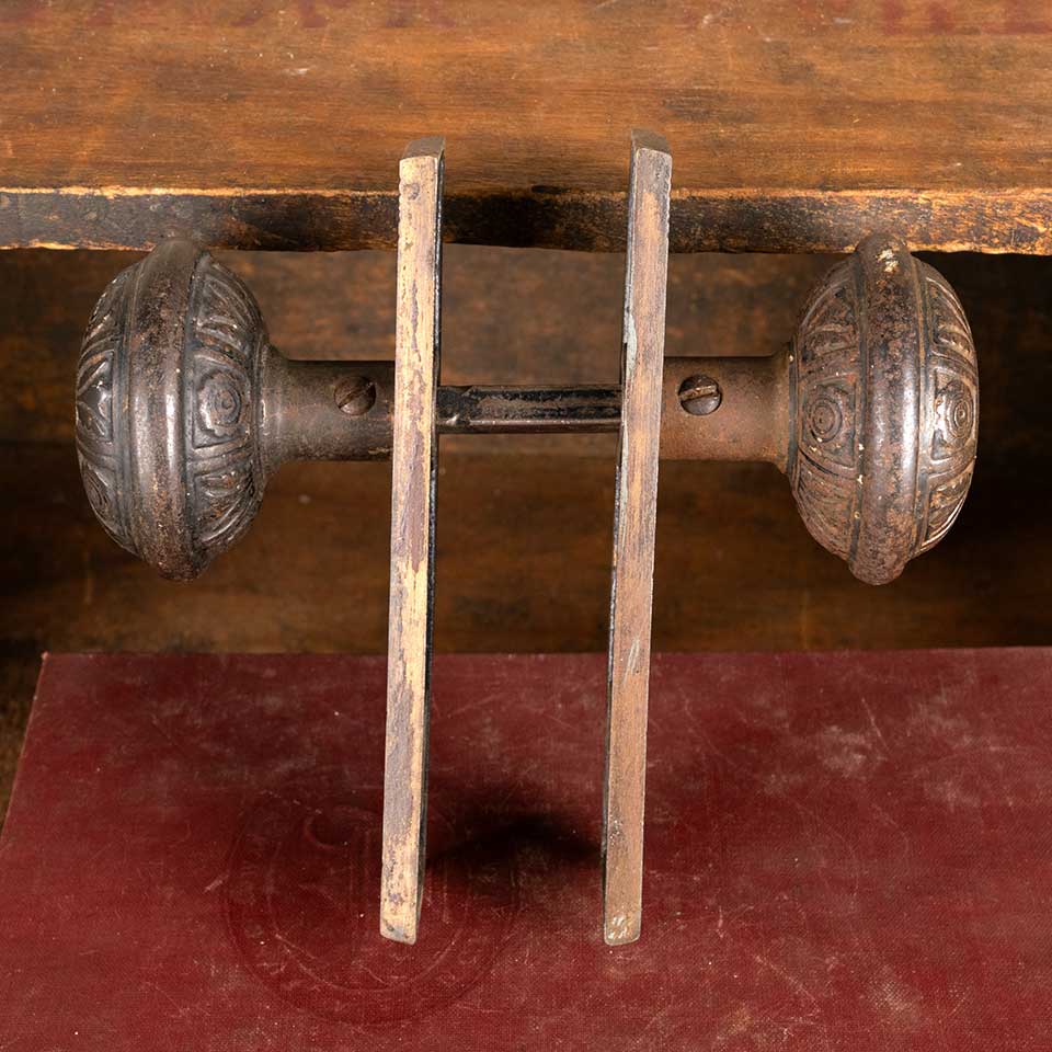 Architectural salvage antique Lockwood pattern c. 1884 ornate cast iron interior door hardware set including a pair of doorknobs (2 1/4" in diameter), a tapped spindle with set screws, and a pair of backplates (1 1/2" wide x 5 1/4" tall). See photos to evaluate condition. Priced at $195 for the set.