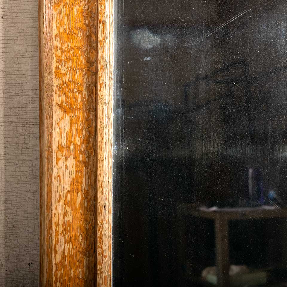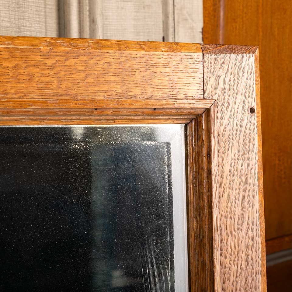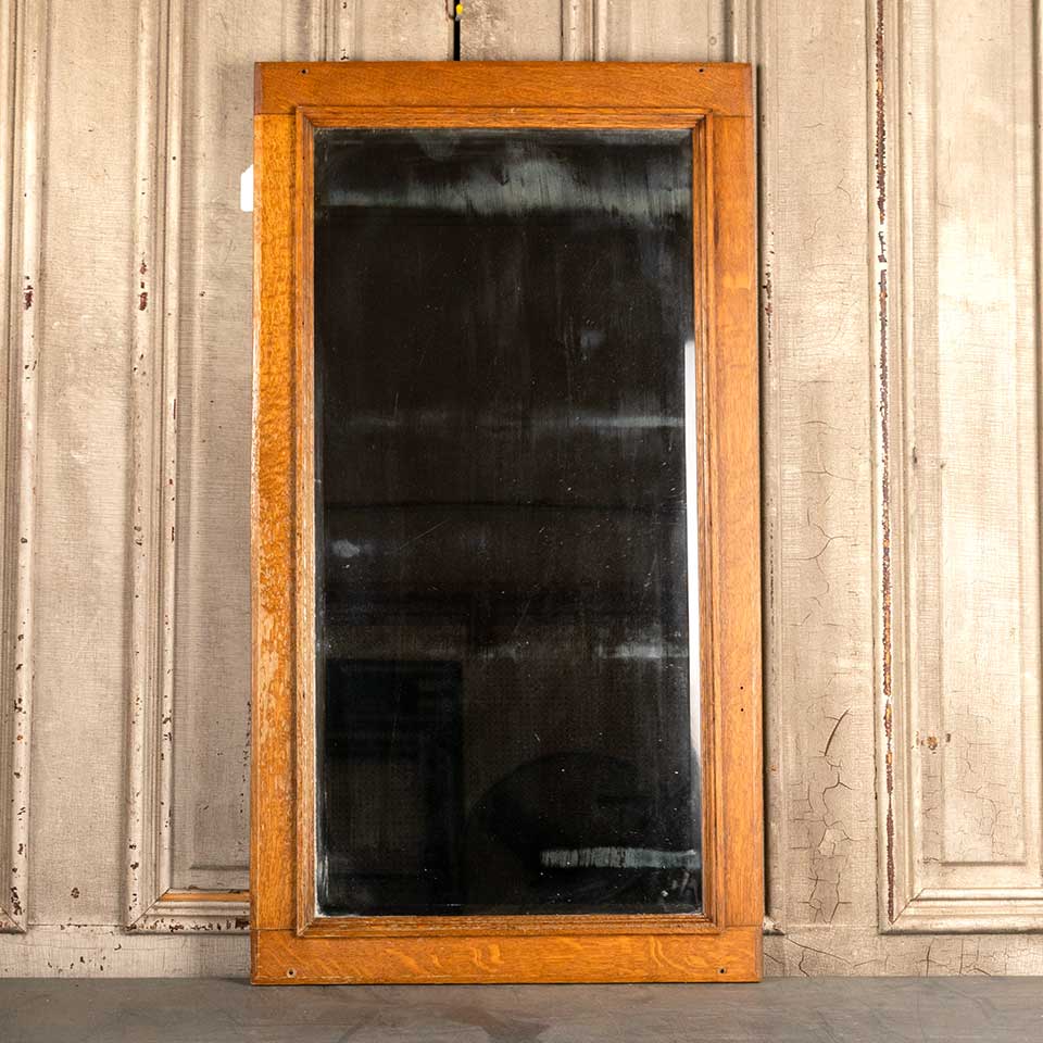 Architectural salvage antique beveled glass mirror in oak frame measuring approx. 41 5/16" x 22 5/8" x 1 1/2" front to back. See photos to evaluate condition.