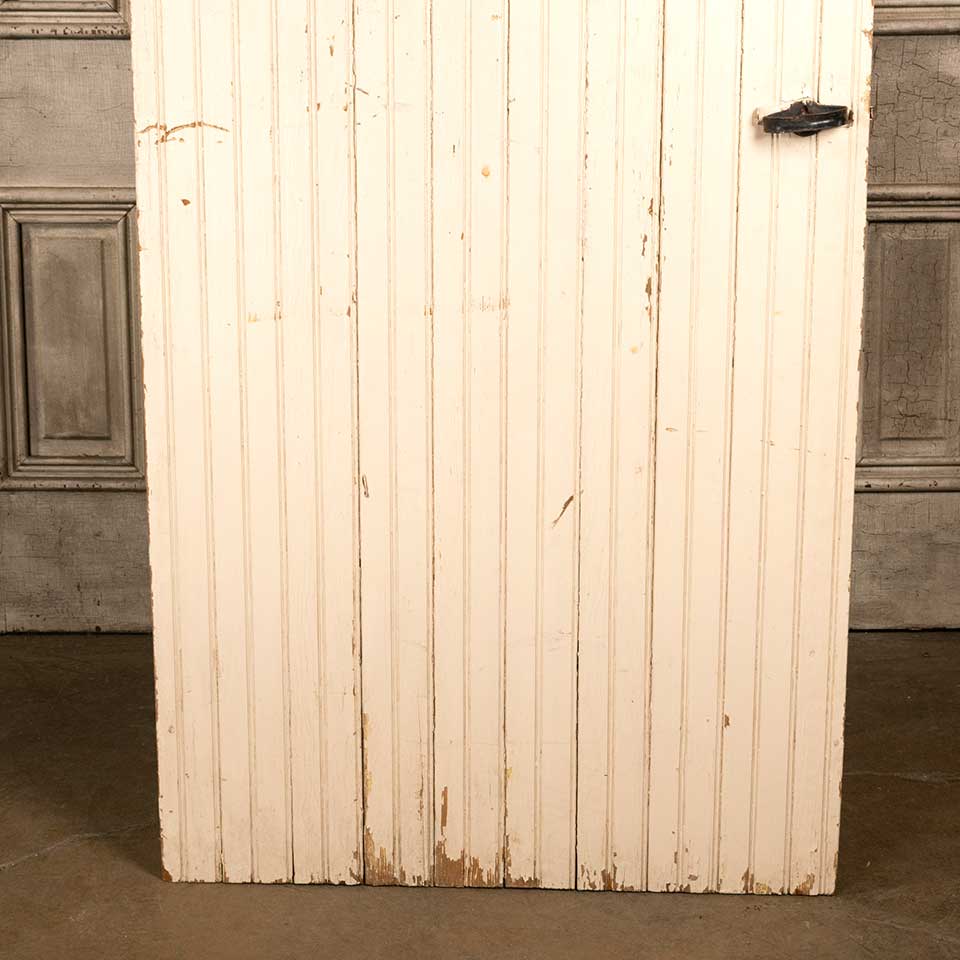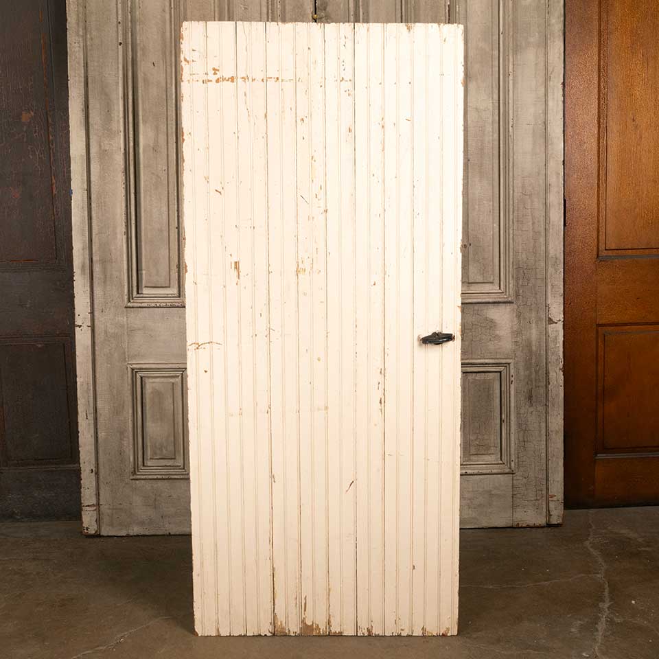 Architectural salvage antique painted wood beadboard barn door with hardware measuring approx. 31 7/8" wide x 71 1/4" tall x 1 7/8" front to back. See photos to evaluate condition.