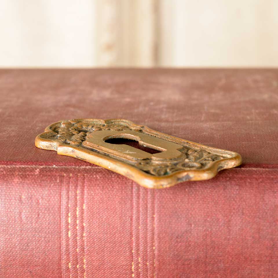 Architectural salvage ornate antique bronze Lockwood (Oakdale pattern c.1914) door skeleton keyhole escutcheon cover plate hardware measuring approx. 1 1/8" x 2 1/4" x 1/16" thick. See photos to evaluate condition.