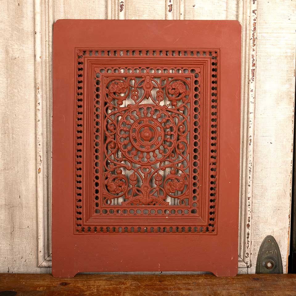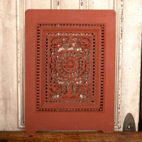 Architectural salvage antique cast iron fireplace summer front cover measuring approx. 20" wide x 27 1/8" tall x 1" front to back. See photos to evaluate condition.