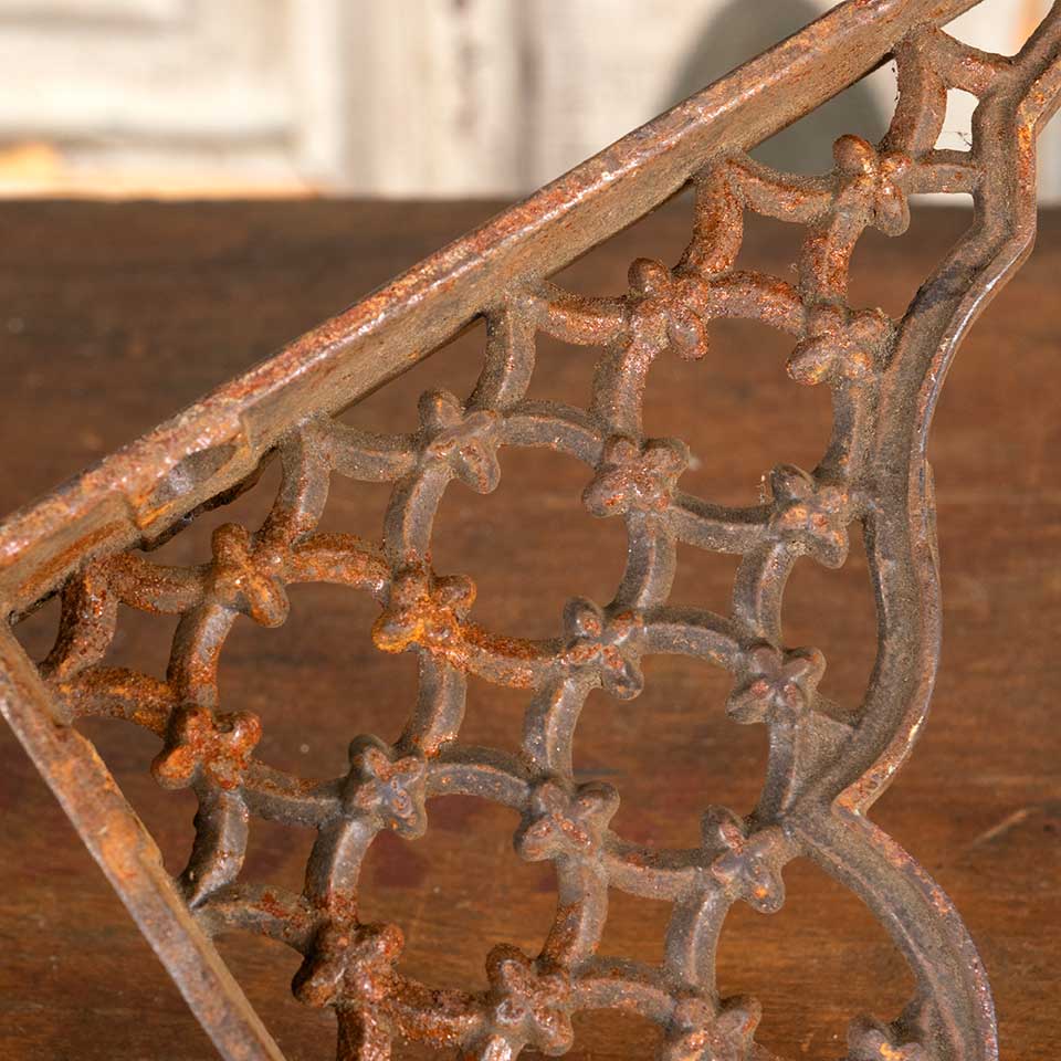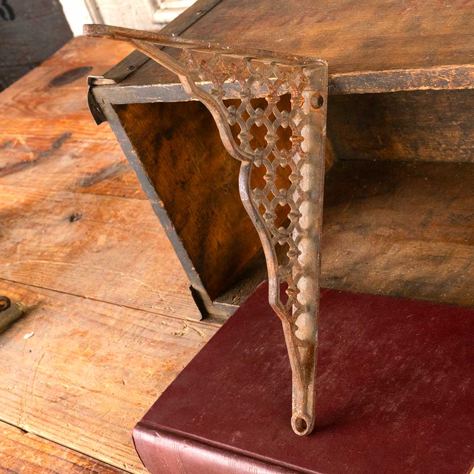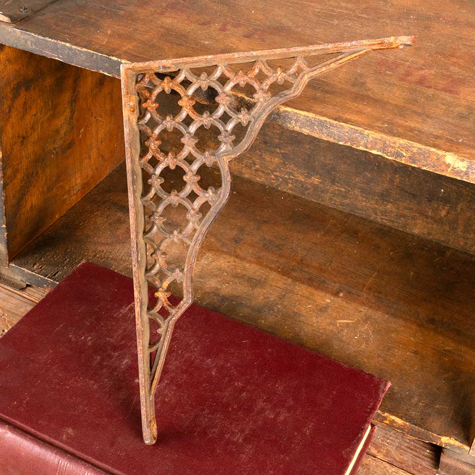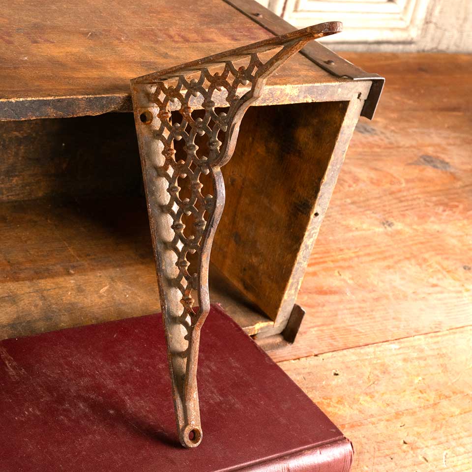 Architectural salvage antique ornate cast iron shelf bracket measuring approx. 7/8" wide (widest point) x 7 15/16" tall x 5 15/16" front to back. See photos to evaluate condition.