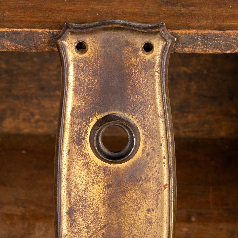 Architectural salvage antique steel Arts & Crafts doorknob backplate hardware measuring approx. 2 3/8" wide x 6 7/8" tall with a 3/4" diameter collar. The spindle and keyhole measure 2 1/2" on centers. Condition and color may vary, see photos to evaluate. Priced at $25/each.