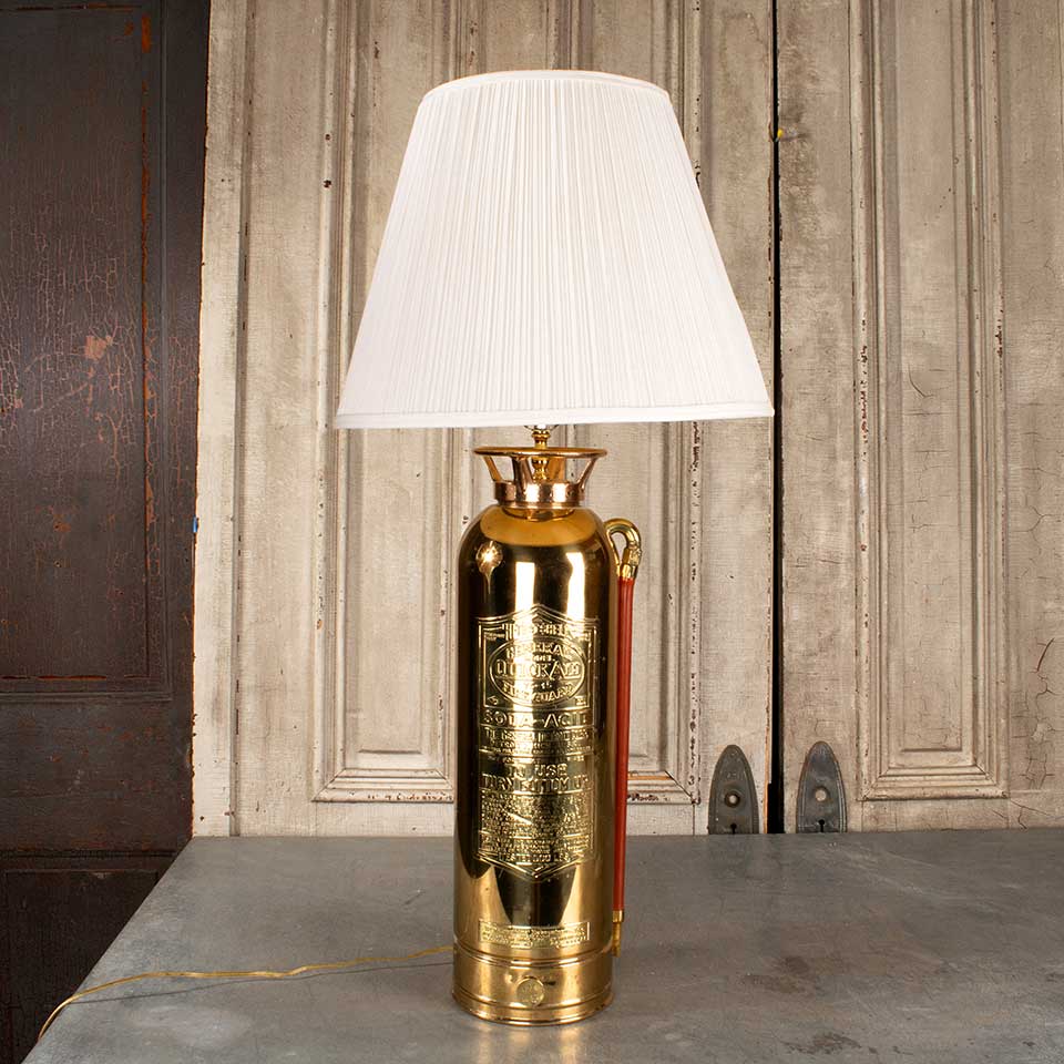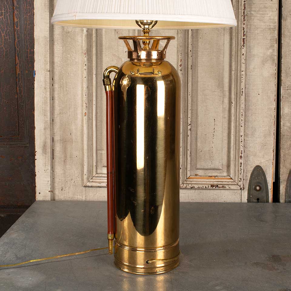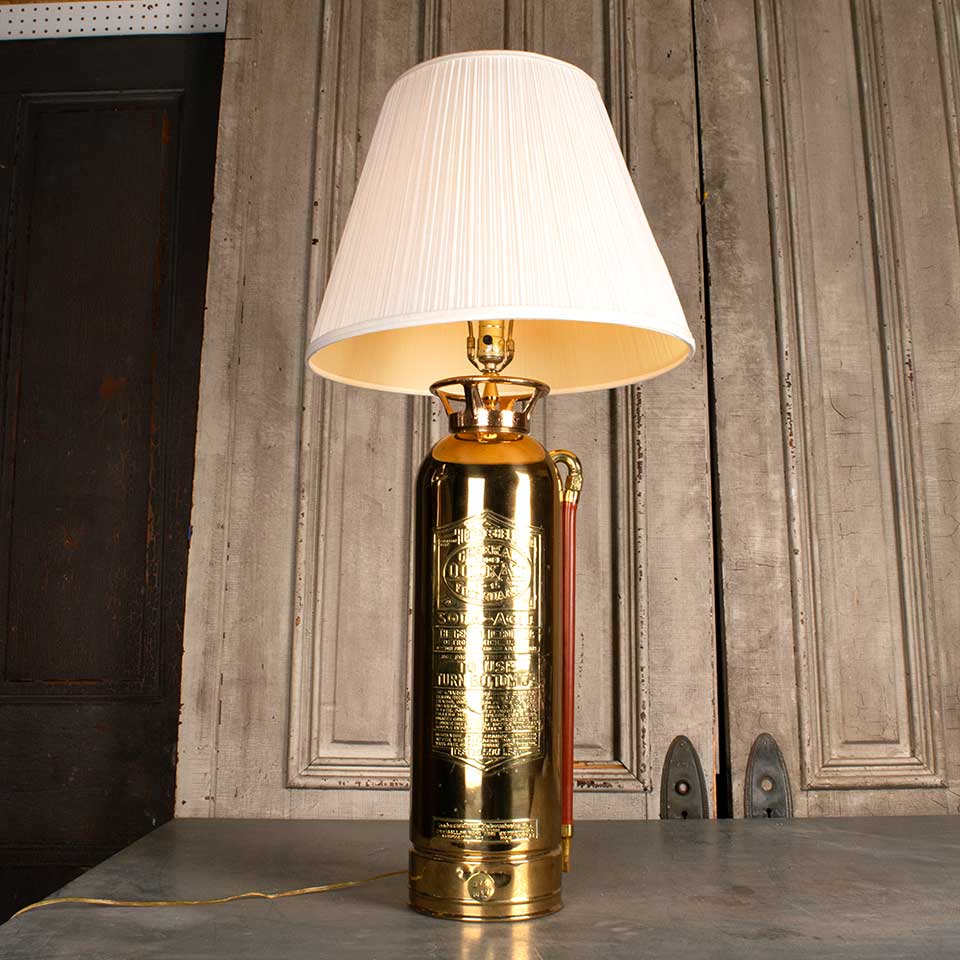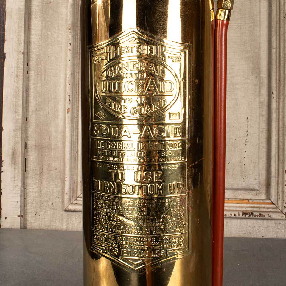 Repurposed antique Quick Aid brass soda-acid fire extinguisher table lamp measuring approx. 7 1/8" in diameter x 39 1/2" tall (overall). Made by The General Detroit Corporation. See photos to evaluate condition.