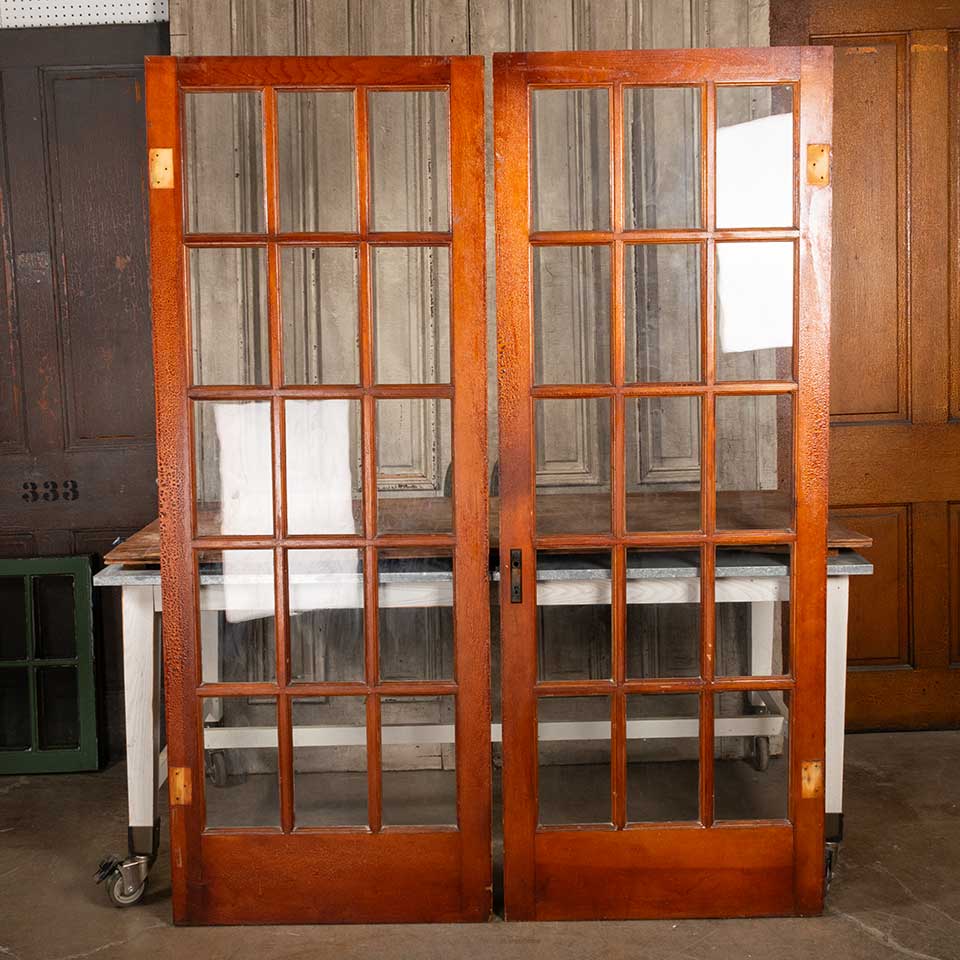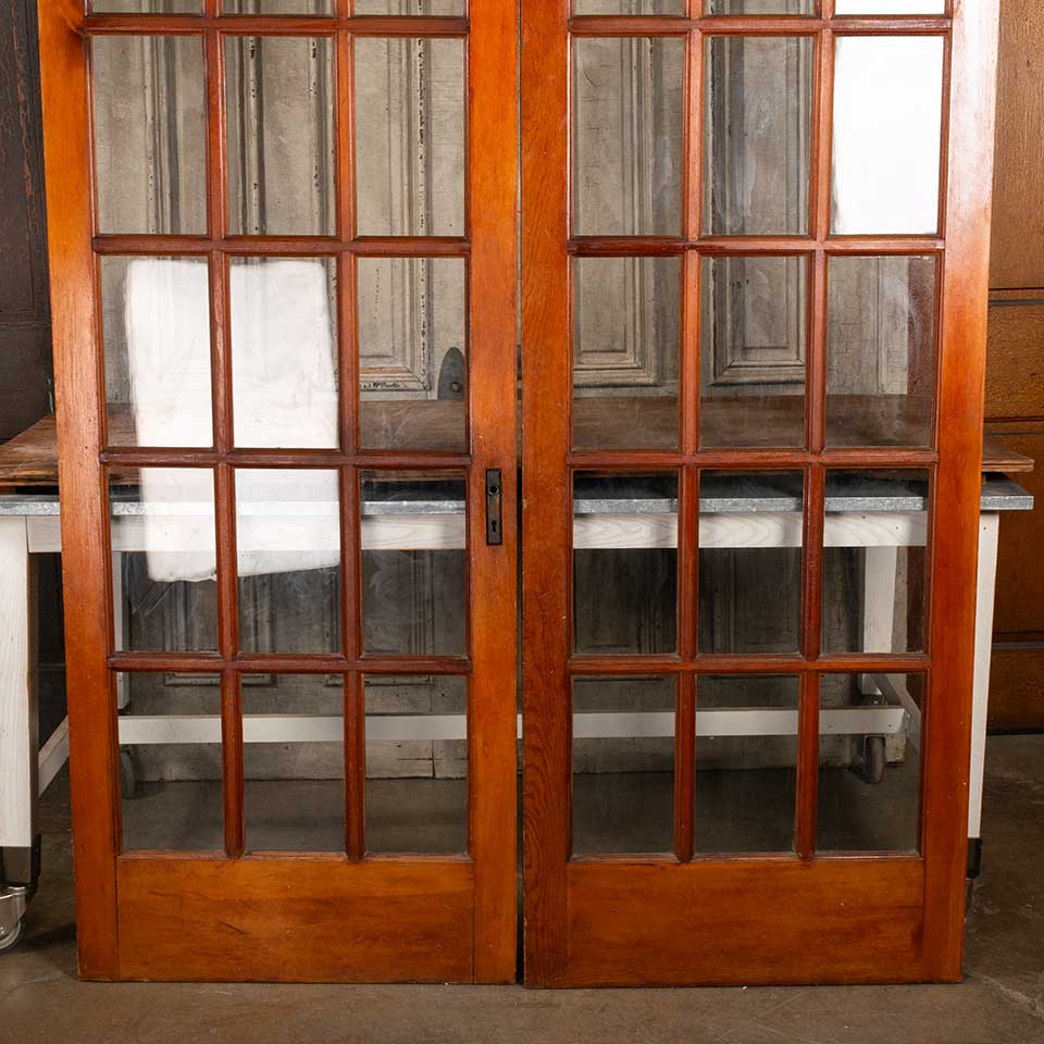Pair of architectural salvage antique pine wood 15 lite interior French doors together measuring approx. 60 1/8" wide x 79 1/4" tall x 1 3/8 thick. See photos to evaluate condition. Priced at $1,100 for the pair.