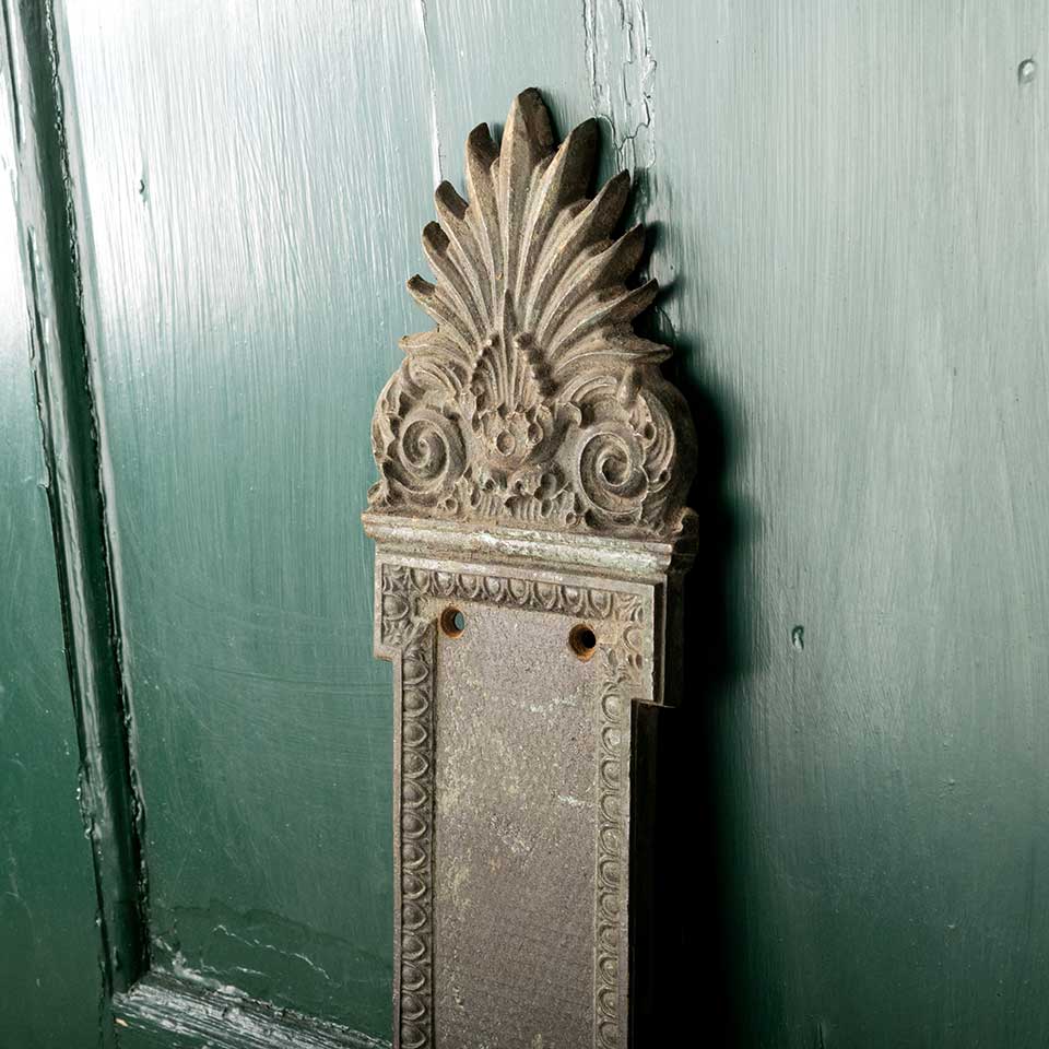 Architectural salvage antique ornate cast bronze Greek Revival doorknob backplate door hardware measuring approx. 3 5/8" wide x 15 1/4" tall x 1/4" front to back with a 3/4" diameter brass collar. This hardware was salvaged from the Ohio Statehouse in Columbus, Ohio during it's last major renovation. See photos to evaluate condition.
