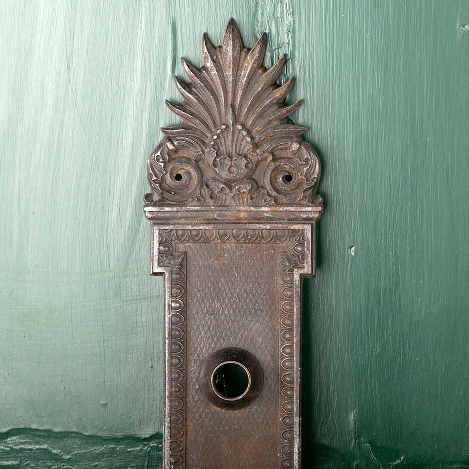 Architectural salvage antique ornate cast iron Greek Revival doorknob backplate with thumb turn measuring approx. 3 5/8" wide x 15 1/2" tall x 1/4" front to back with a 3/4" diameter brass collar. The thumb turn spindle measures 3/16" and the distance between collar and thumb turn is 3 1/2" on center. This hardware was salvaged from the Ohio Statehouse in Columbus, Ohio during it's last major renovation. See photos to evaluate condition.