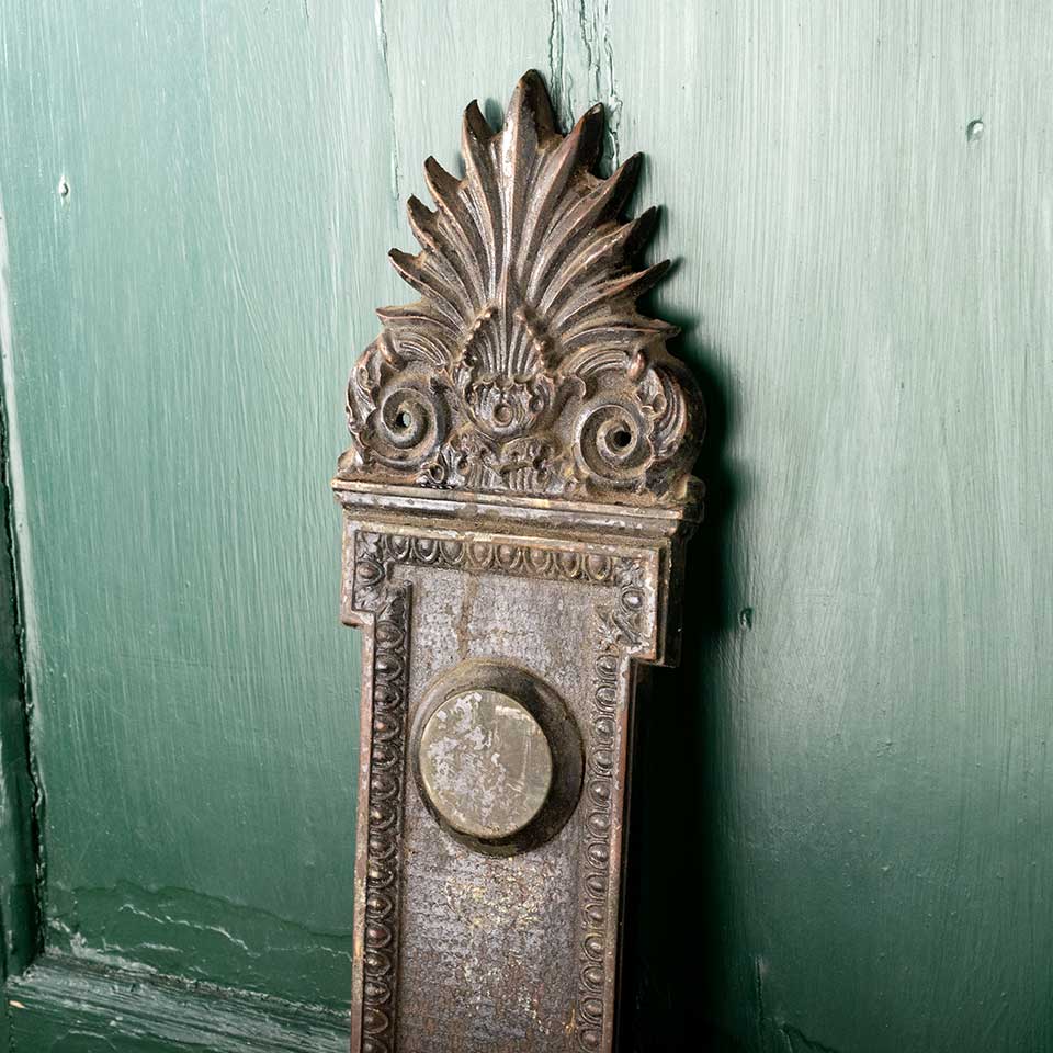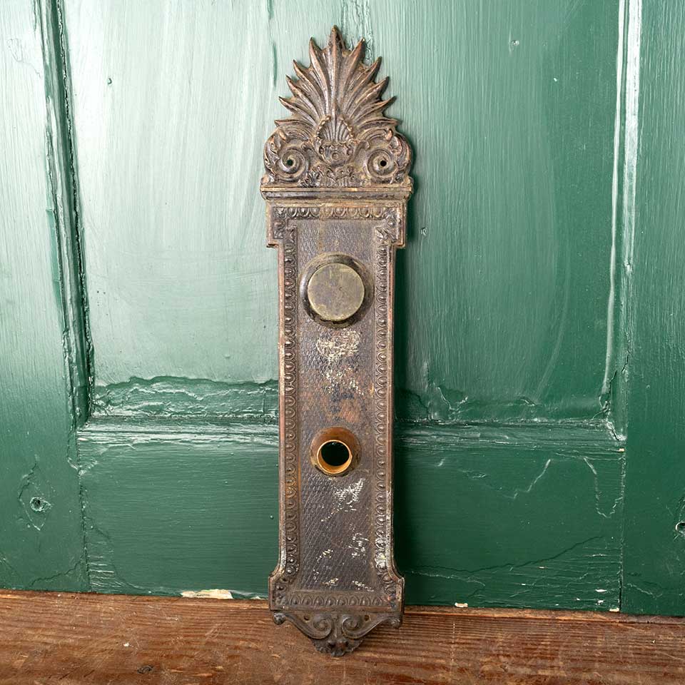 Architectural salvage antique ornate cast bronze Greek Revival doorknob backplate door hardware measuring approximately 3 7/8" wide x 15 3/4" tall x 3/8" front to back with a 3/4" diameter collar. This hardware was salvaged from the Ohio Statehouse in Columbus, Ohio during it's last major renovation. See photos to evaluate condition.