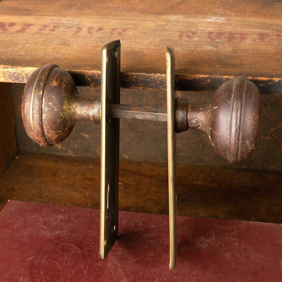 Architectural salvage antique metal doorknob door hardware set includes a pair of 2 1/4" diameter doorknobs, a pair of 1 3/4" wide x 5 3/4" tall backplates, and a tapped spindle with 2 set screws. Color and condition vary, see photos to evaluate. Priced at $75/set.