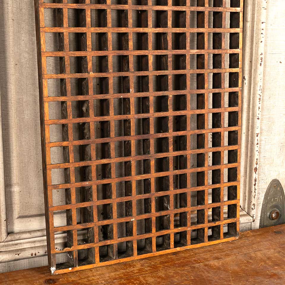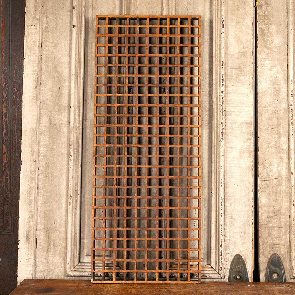 Hard to find architectural salvage antique oak wood cold air return grate floor vent cover measuring approx. 16" x 40" x 1 1/4" front to back. See photos to evaluate condition.