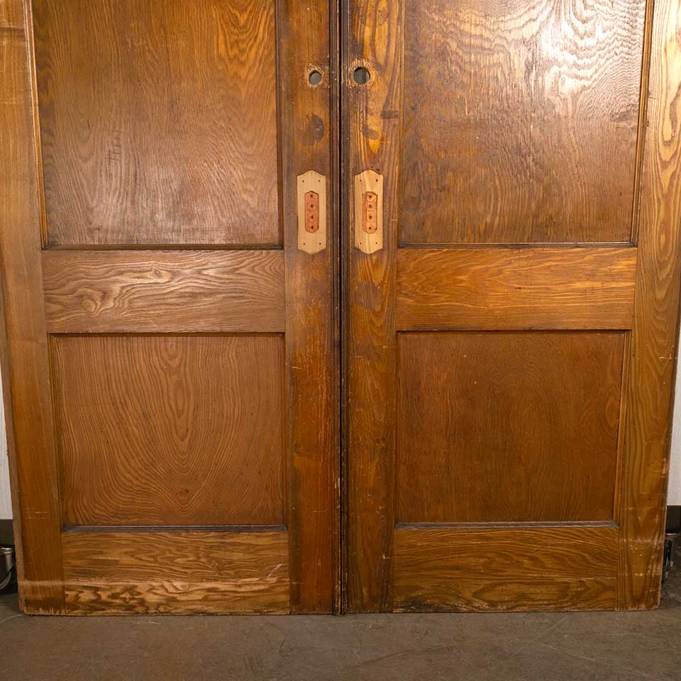 Pair of architectural salvage antique oak wood two panel pocket doors together measuring approx. 61 1/4" wide x 82 7/8" tall x 1 3/4" thick. See photos to evaluate condition. Priced at $450 for the pair.