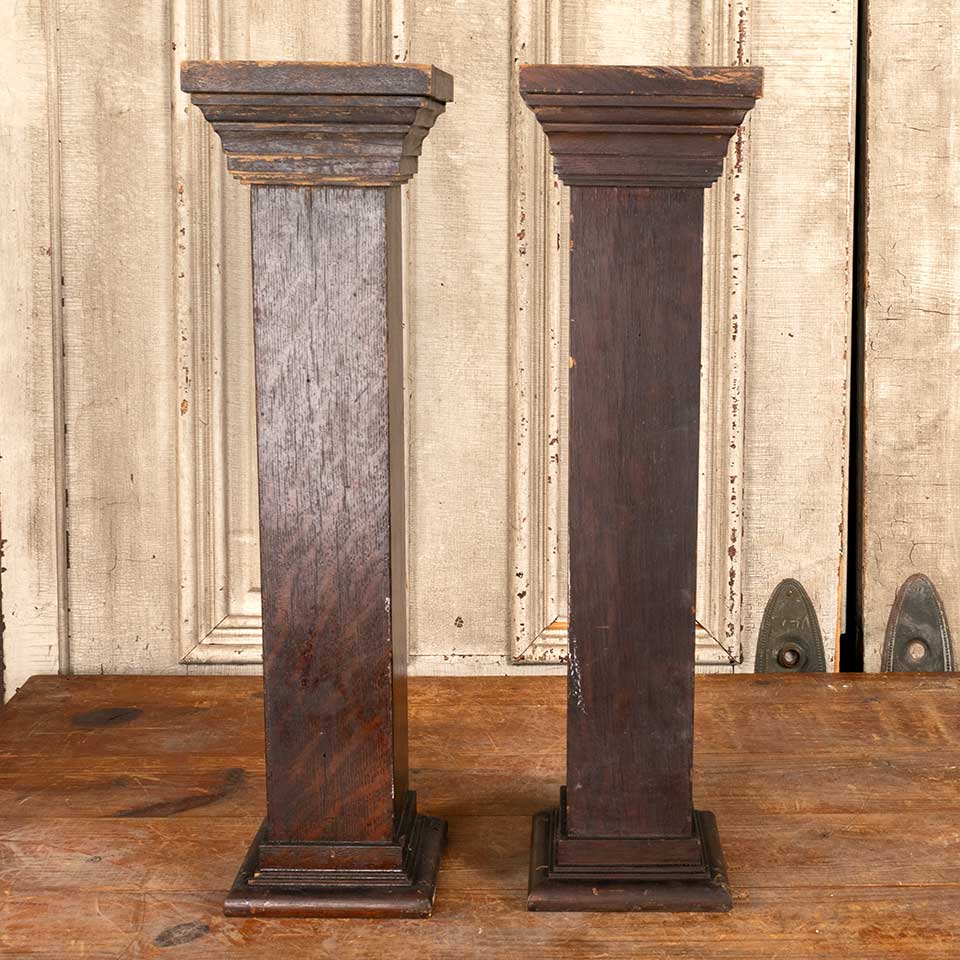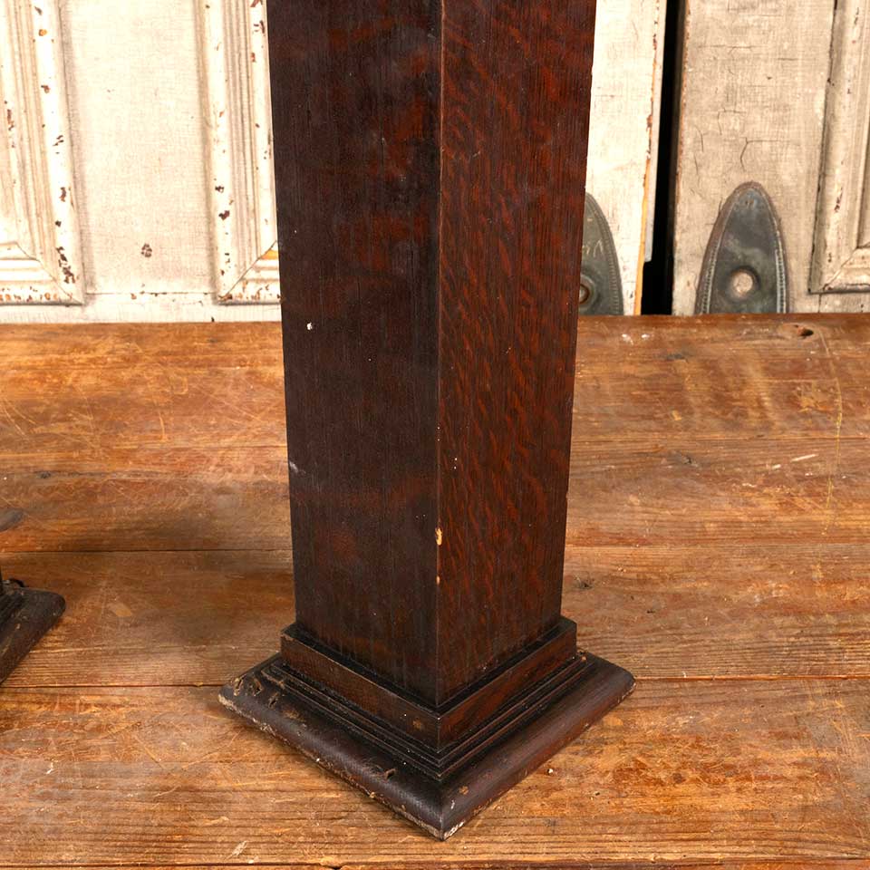 Pair of architectural salvage antique square oak wood fireplace mantel / mantle columns each measuring approx. 24" tall with a 6" x 6" base with a 6 1/2" x 6 1/2" column capital. See photos to evaluate condition. Priced at $195 for the pair.