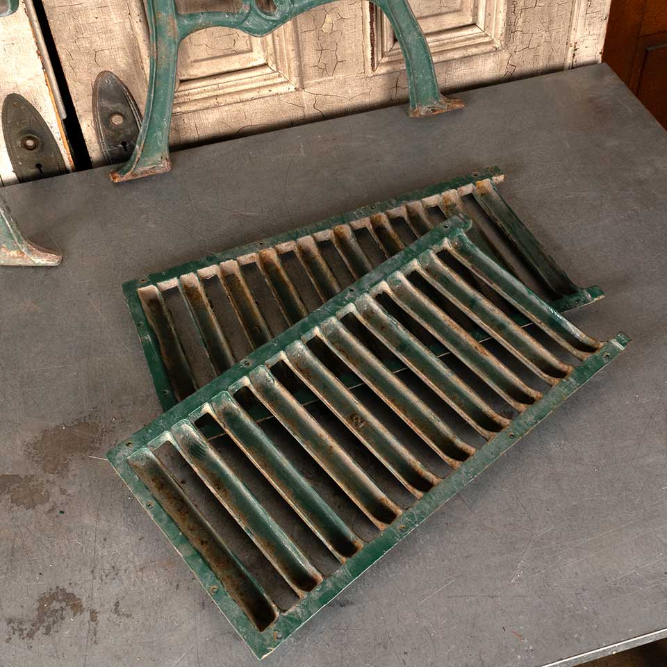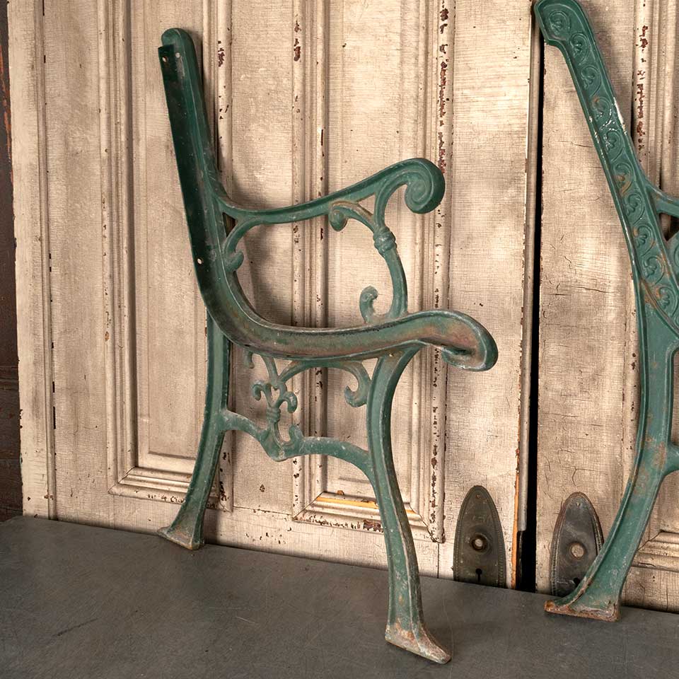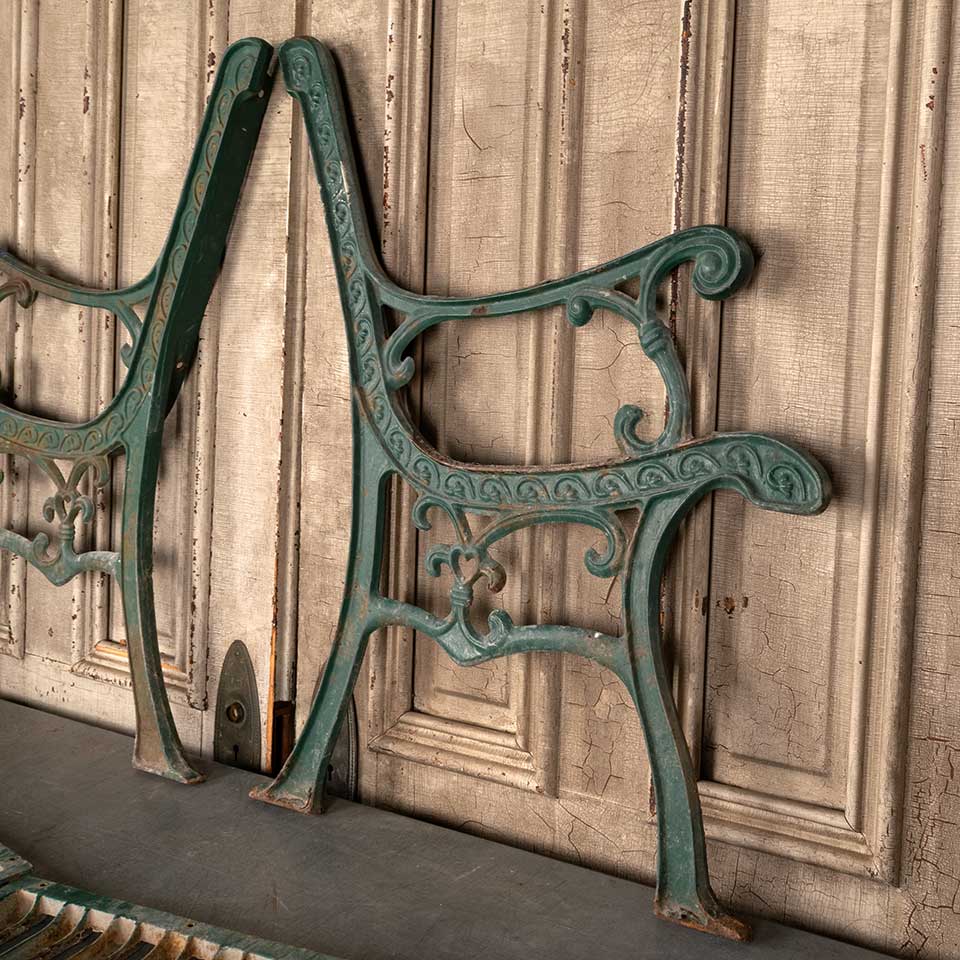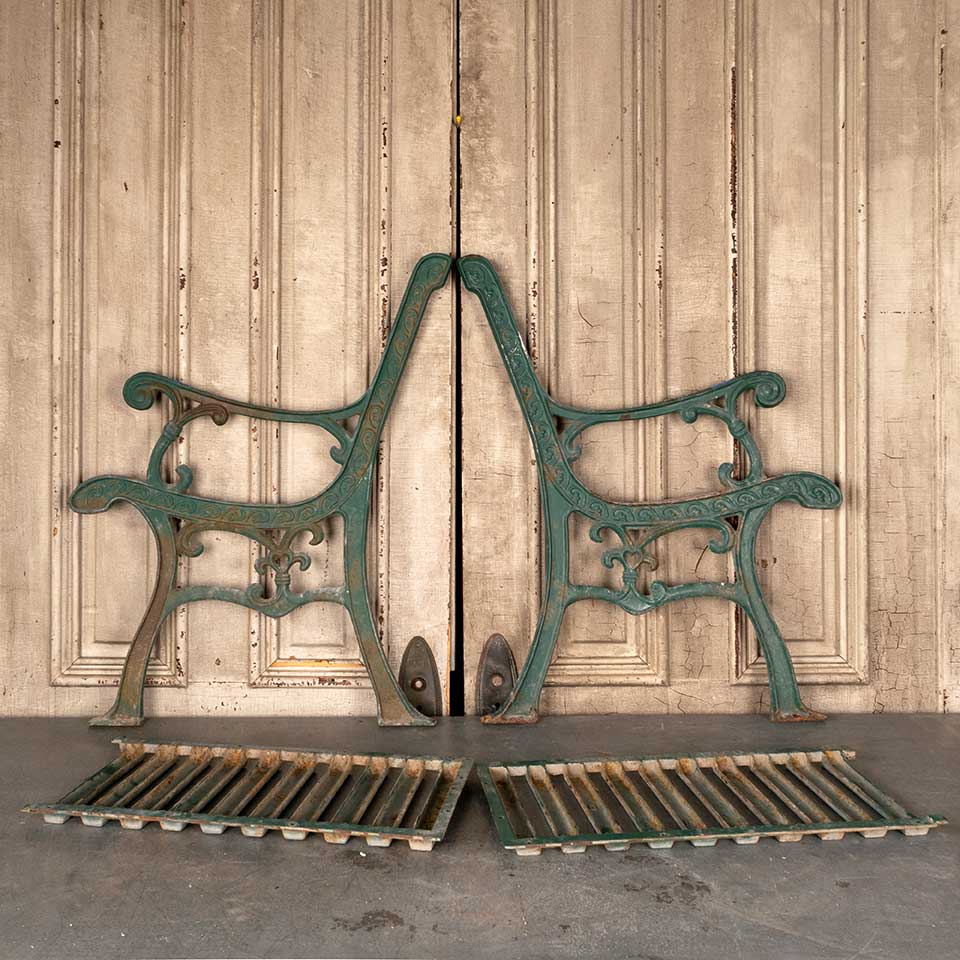 Pair of architectural salvage cast iron garden / park bench ends each measuring approx. 1" wide x 32 1/2" tall x 23 1/2" front to back. The set includes two slatted metal back pieces. See photos to evaluate condition. Priced at $150 for the set.