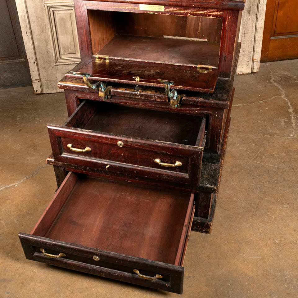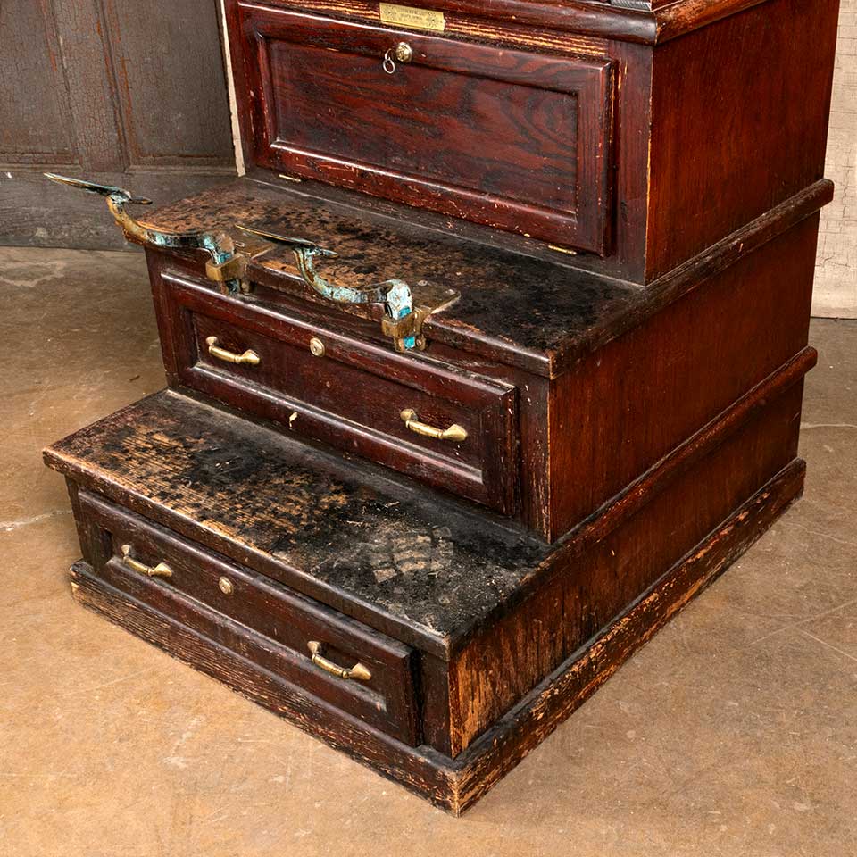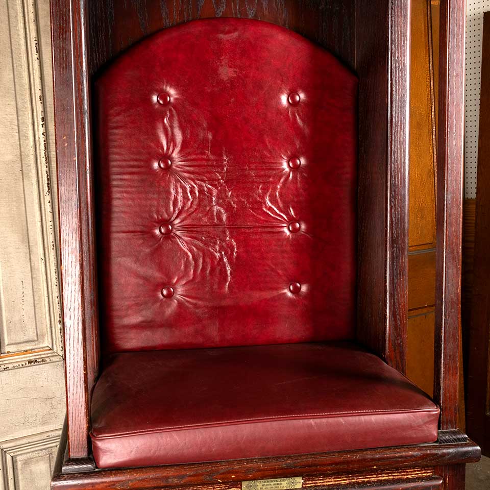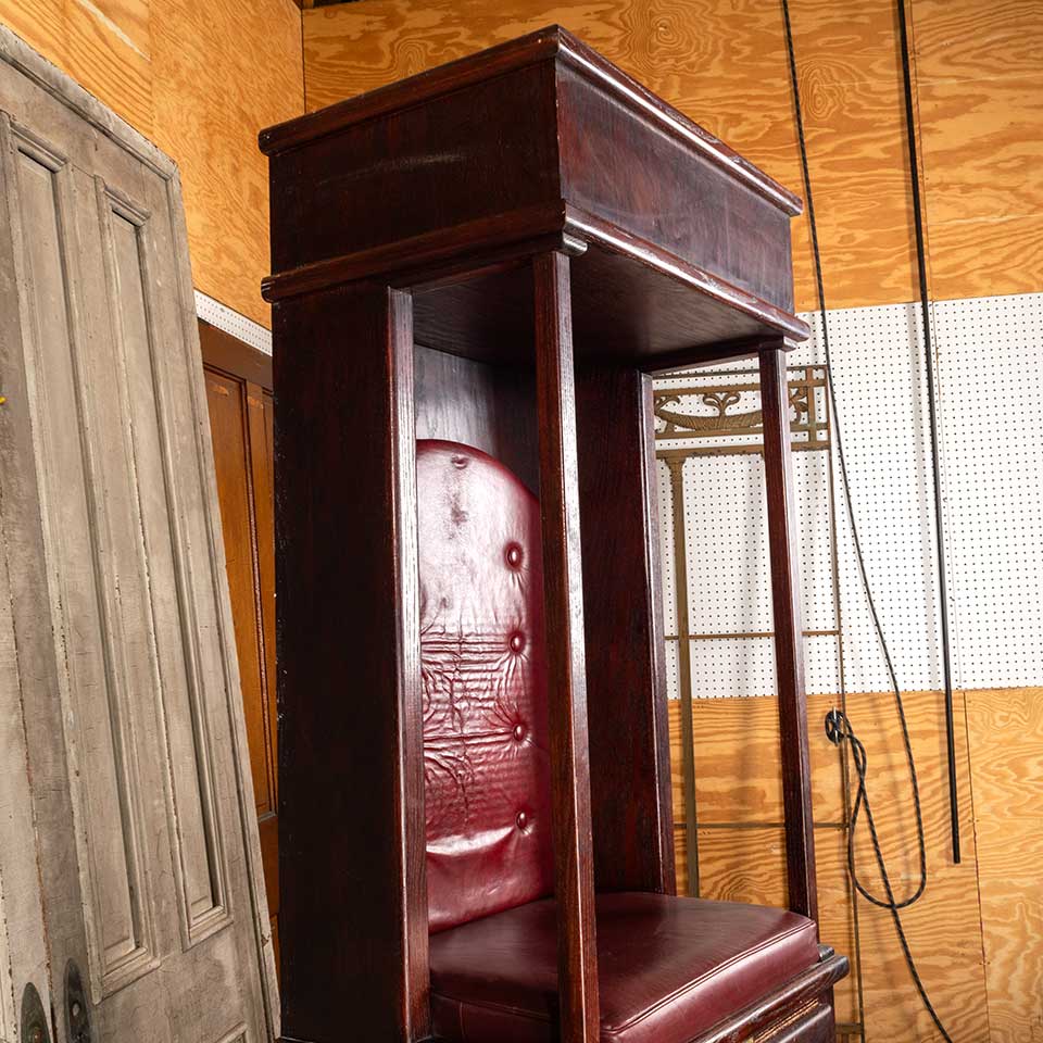 Architectural salvage wood shoeshine stand / booth / chair with removable brass foot rests and lockable pull out storage drawers measuring approx. 31 1/2" wide x 88 1/2" tall x 38" back to front. This is not an antique. See photos to evaluate condition.