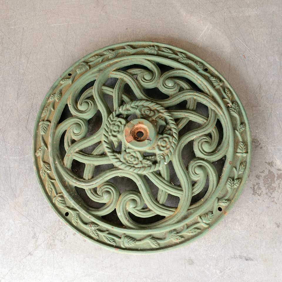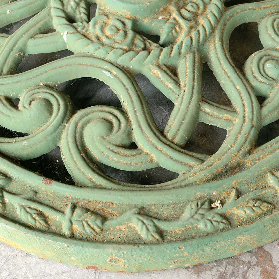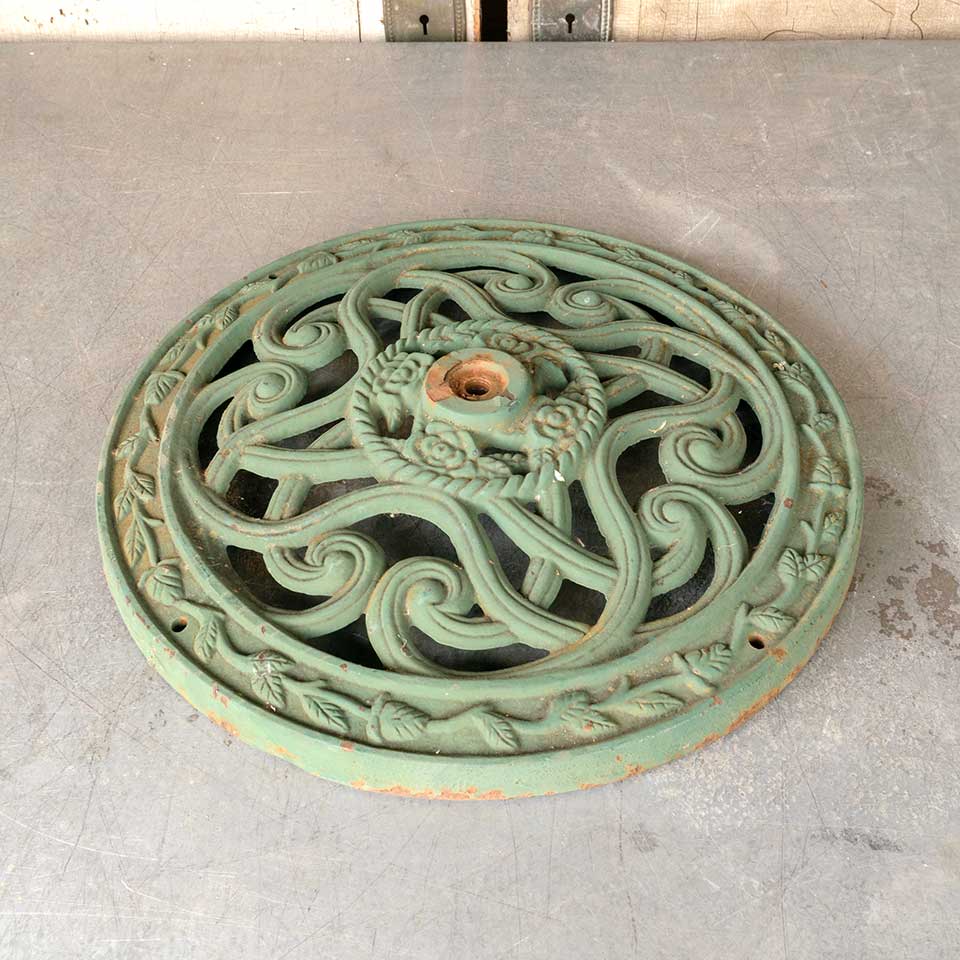 Architectural salvage ornate round painted cast iron base measuring approx. 18 3/8" in diameter x 2 1/4 " tall with a 1/2" diameter threaded hole in the middle. See photos to evaluate condition.