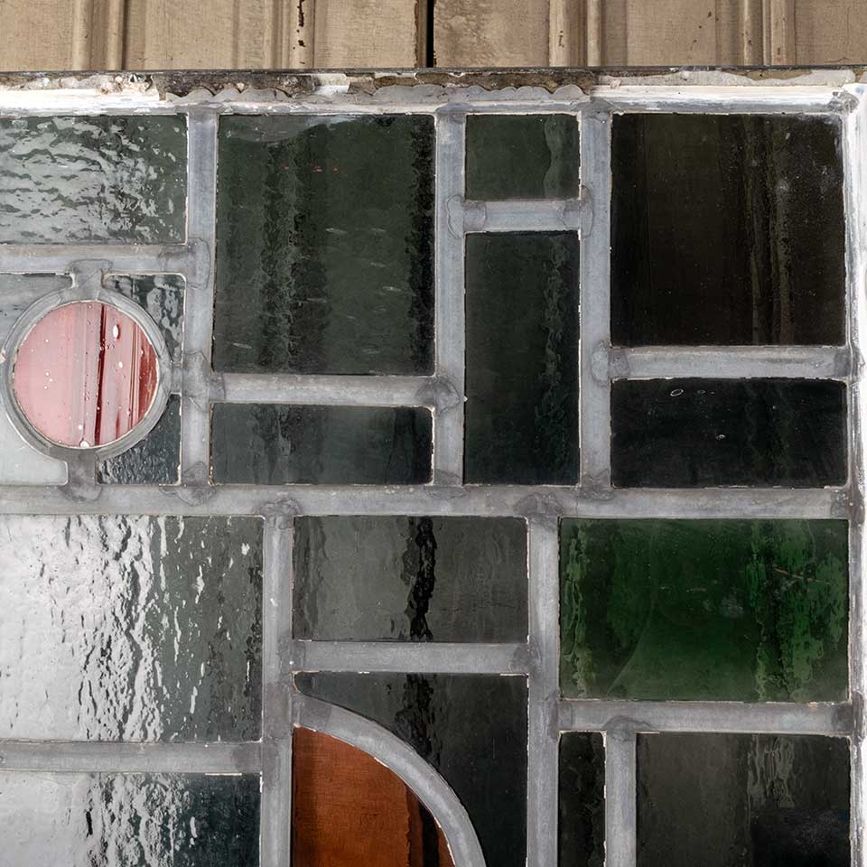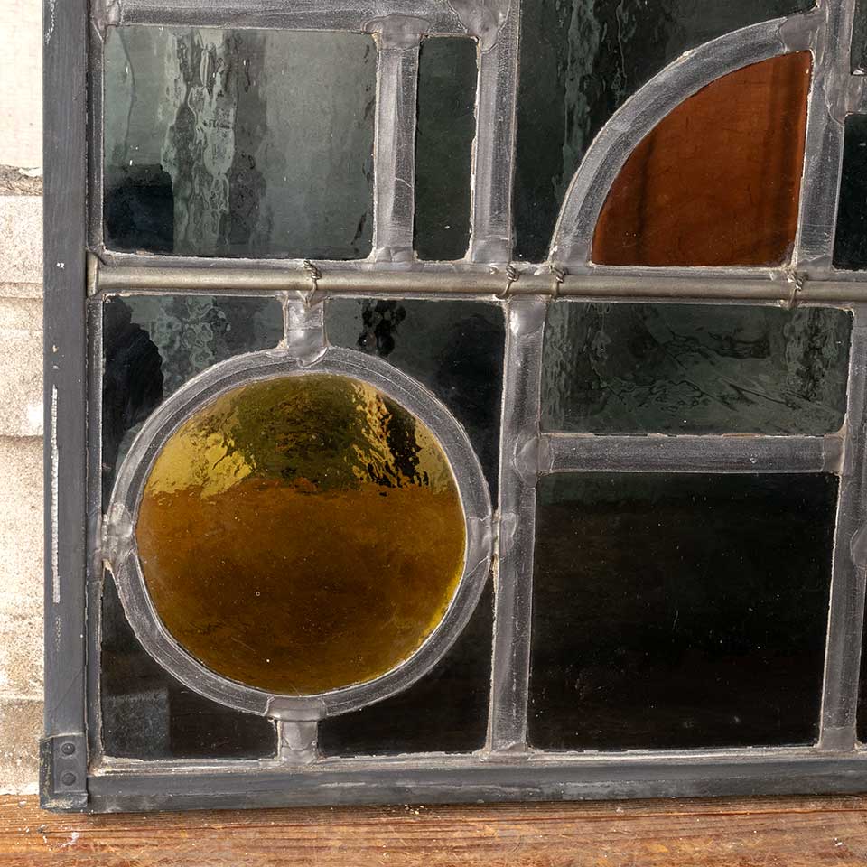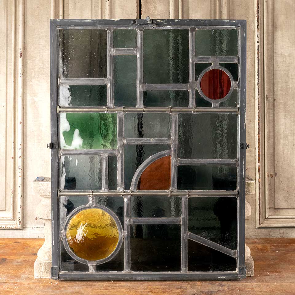 Architectural salvage vintage mid-century modern stained glass window panel with rondels measuring approx. 23 1/4" wide x 31" tall x 3/4" thick. There are two cracked panes. See photos to evaluate condition.