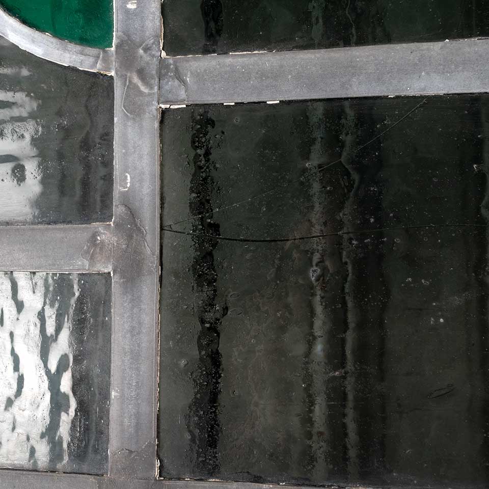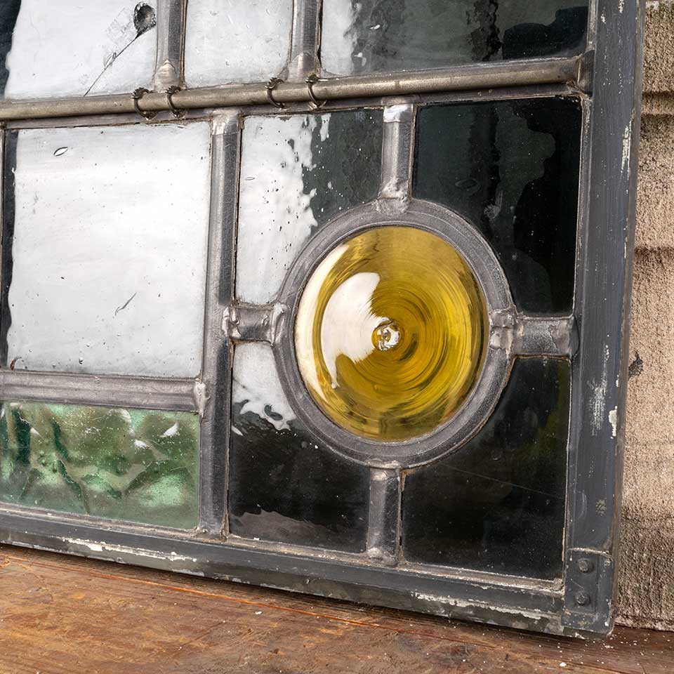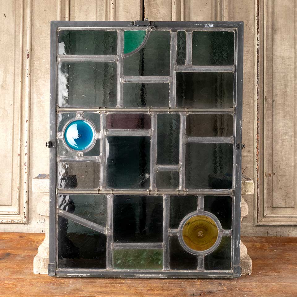 Architectural salvage vintage mid-century modern stained glass window panel with rondels measuring approx. 23 1/4" wide x 31" tall x 3/4" thick. There are two cracked panes. See photos to evaluate condition.