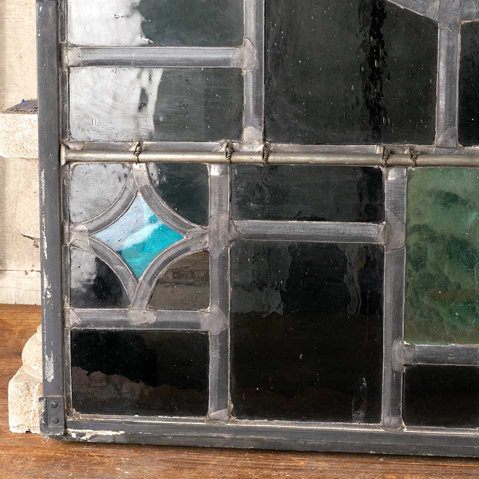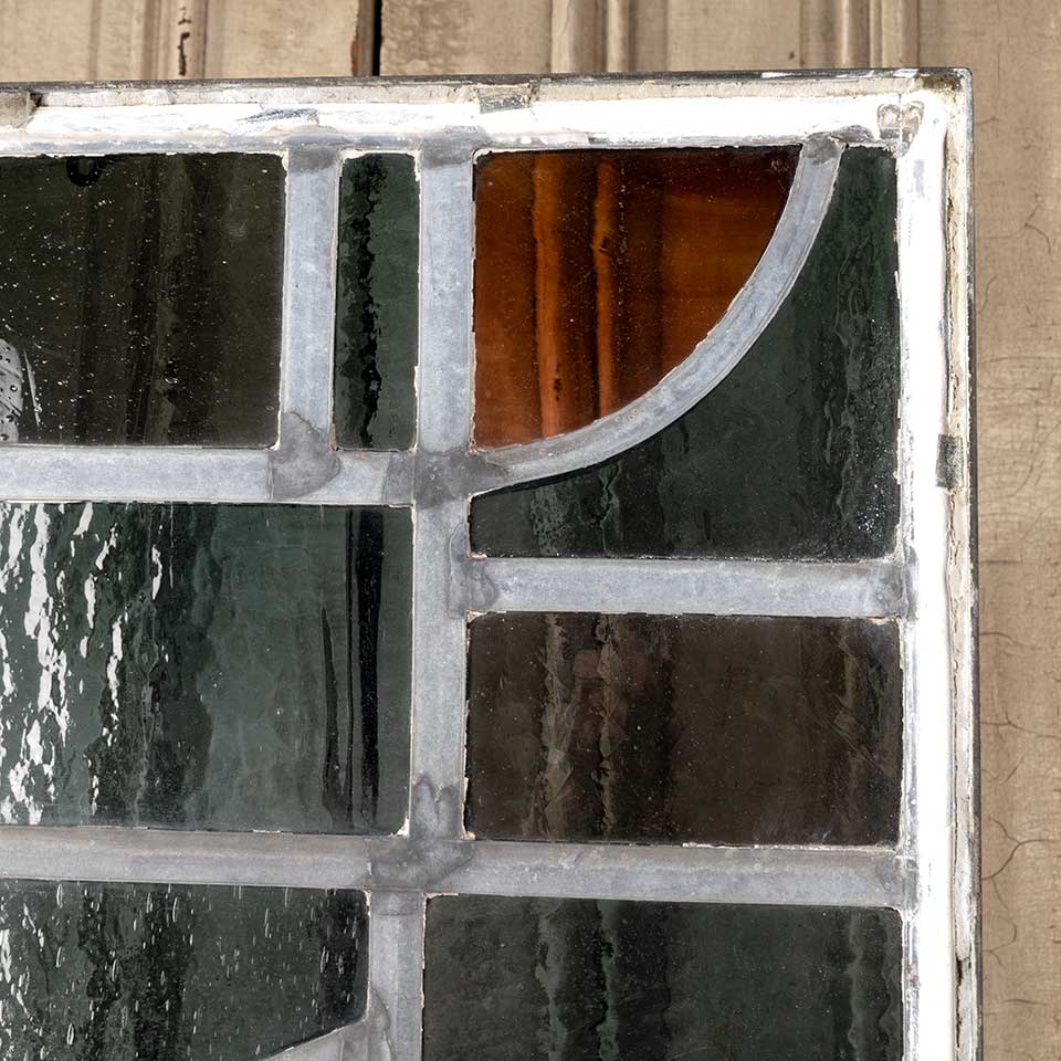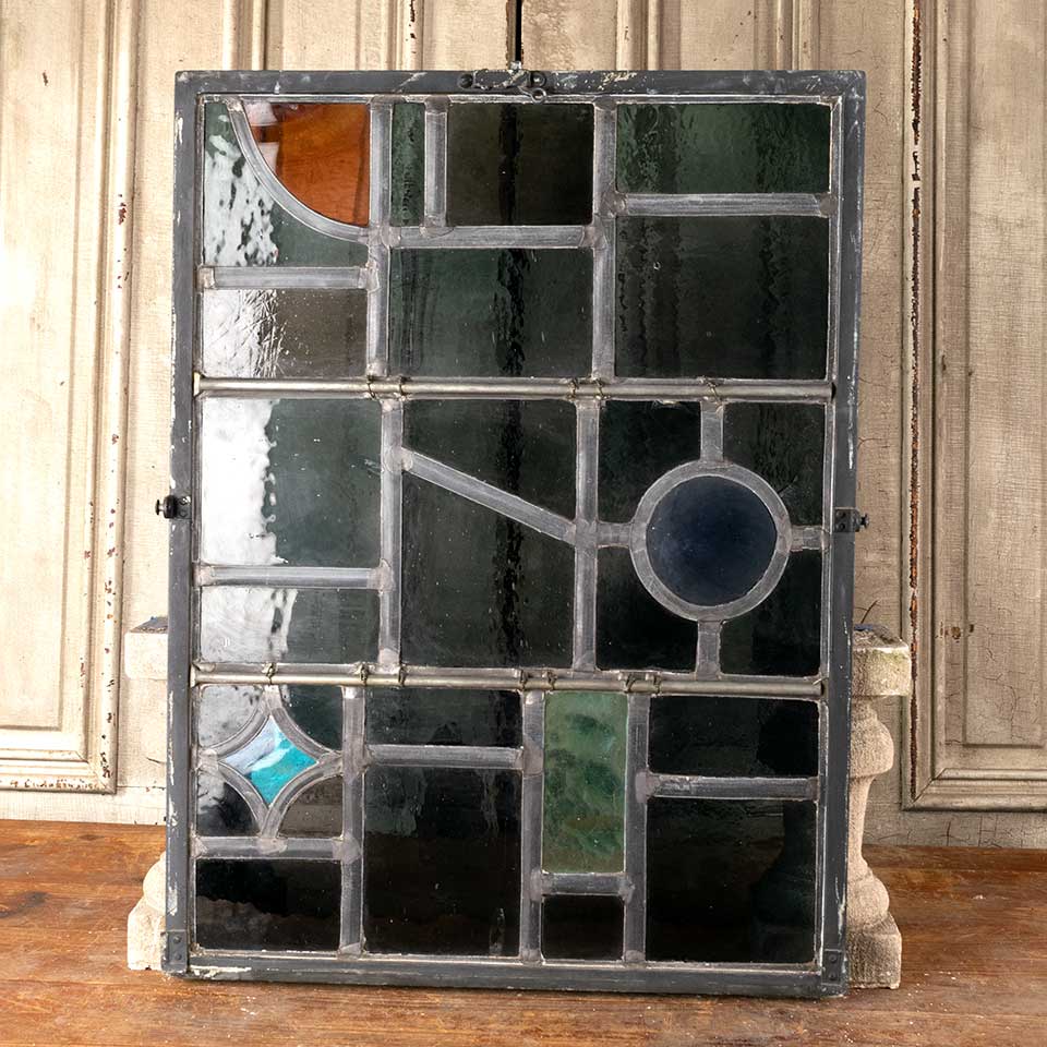 Architectural salvage vintage mid-century modern stained glass window panel with rondels measuring approx. 23 1/4" wide x 31" tall x 3/4" thick. There's one cracked pane. See photos to evaluate condition.