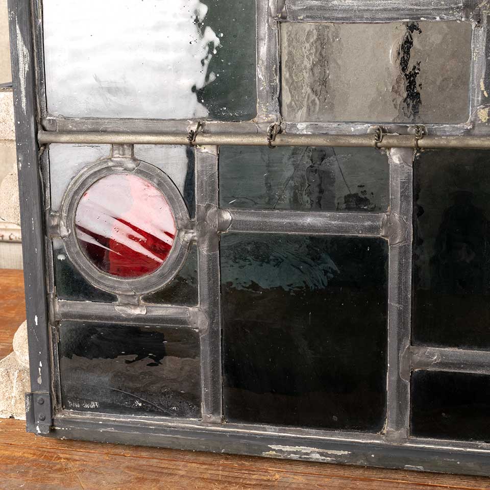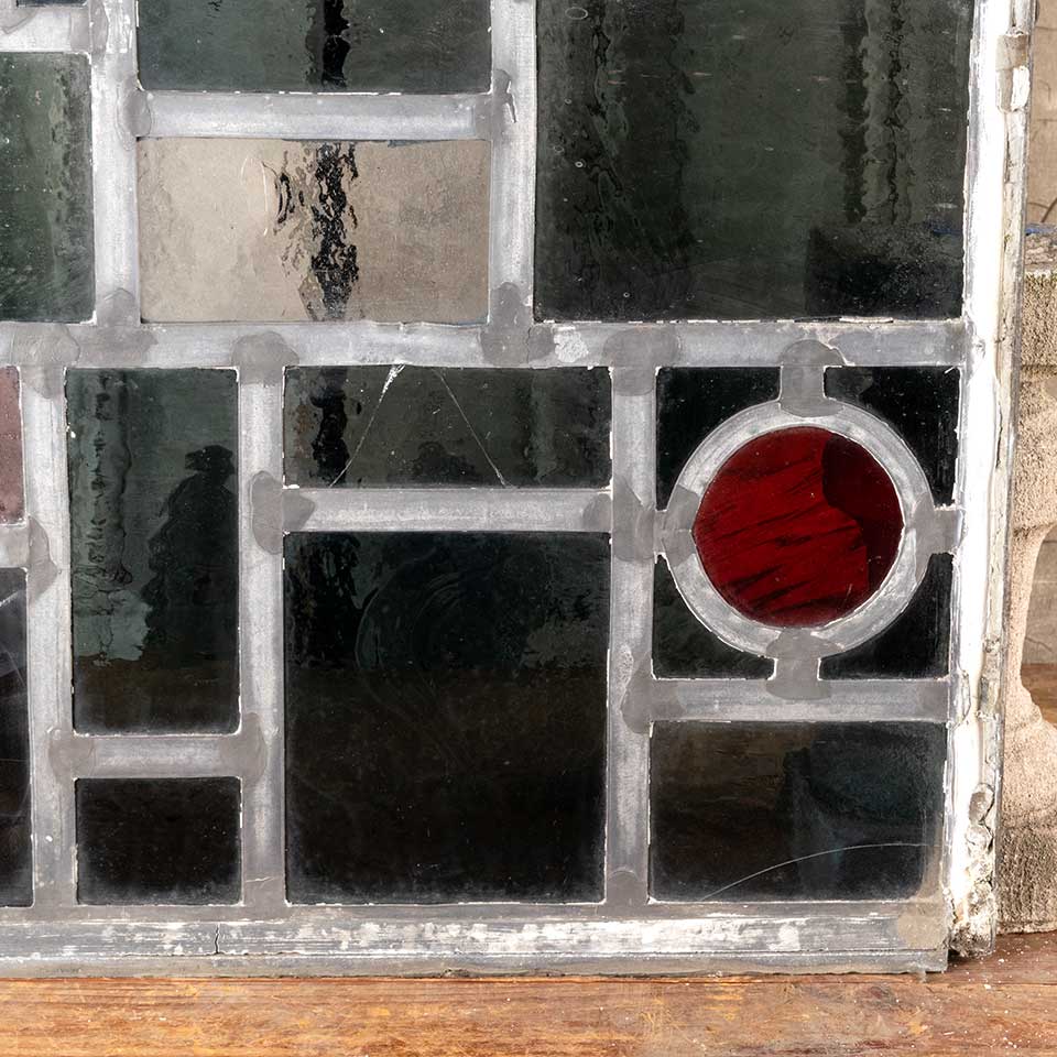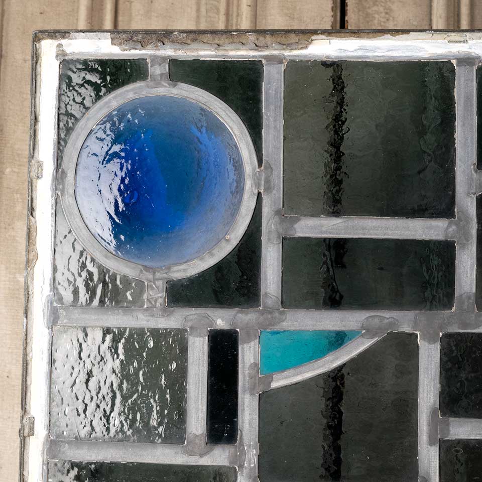 Architectural salvage vintage mid-century modern stained glass window panel with rondels measuring approx. 23 1/4" wide x 31" tall x 3/4" thick. There are two cracked panes. See photos to evaluate condition.