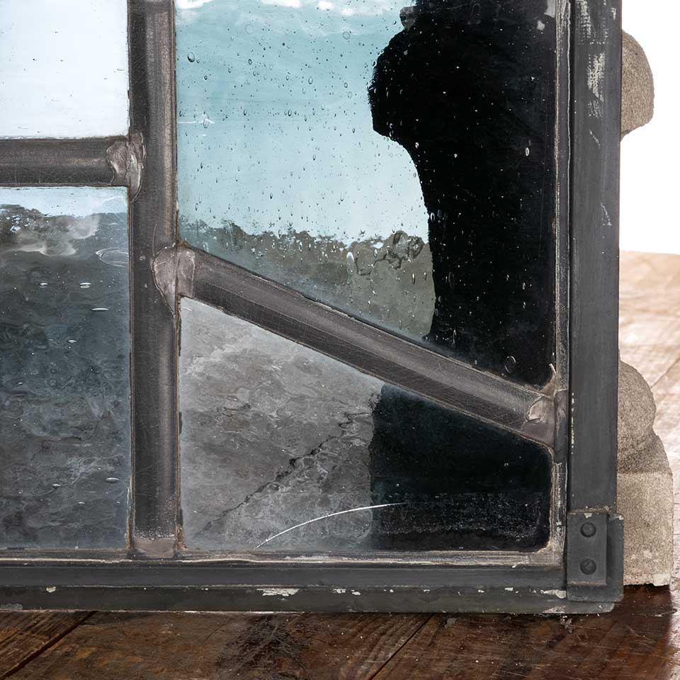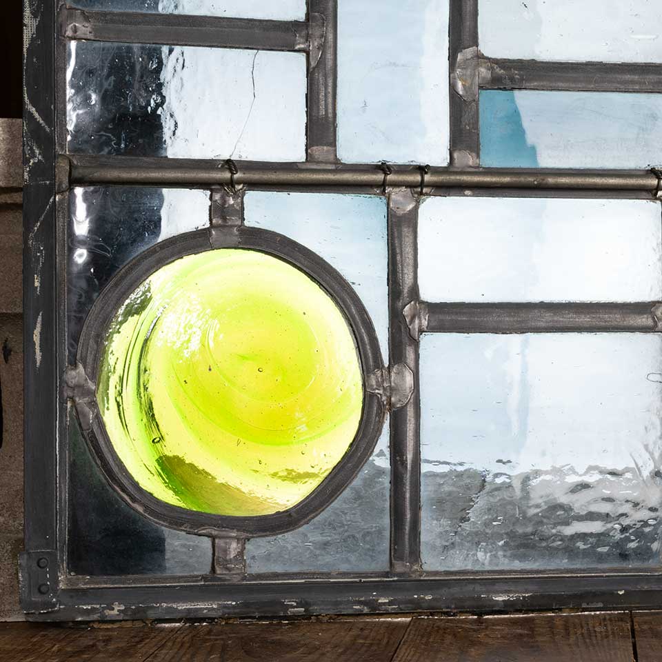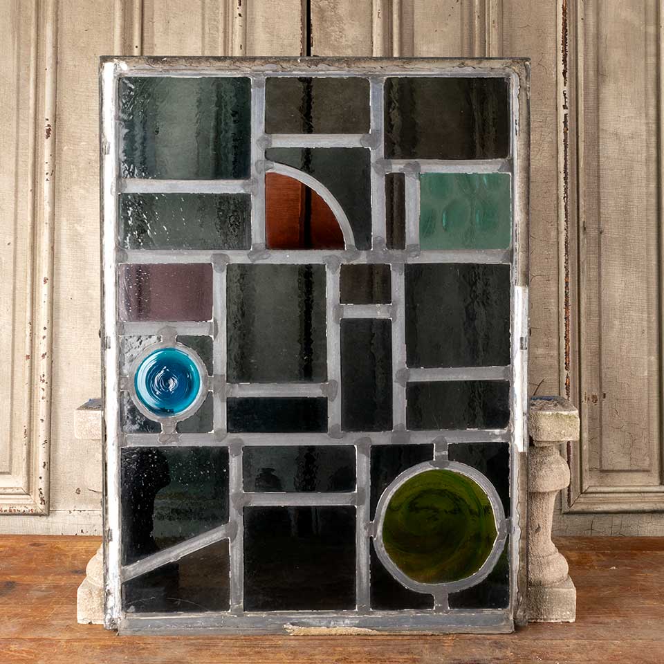 Architectural salvage vintage mid-century modern stained glass window panel with rondels measuring approx. 23 1/4" wide x 31" tall x 3/4" thick. There's one cracked pane. See photos to evaluate condition.