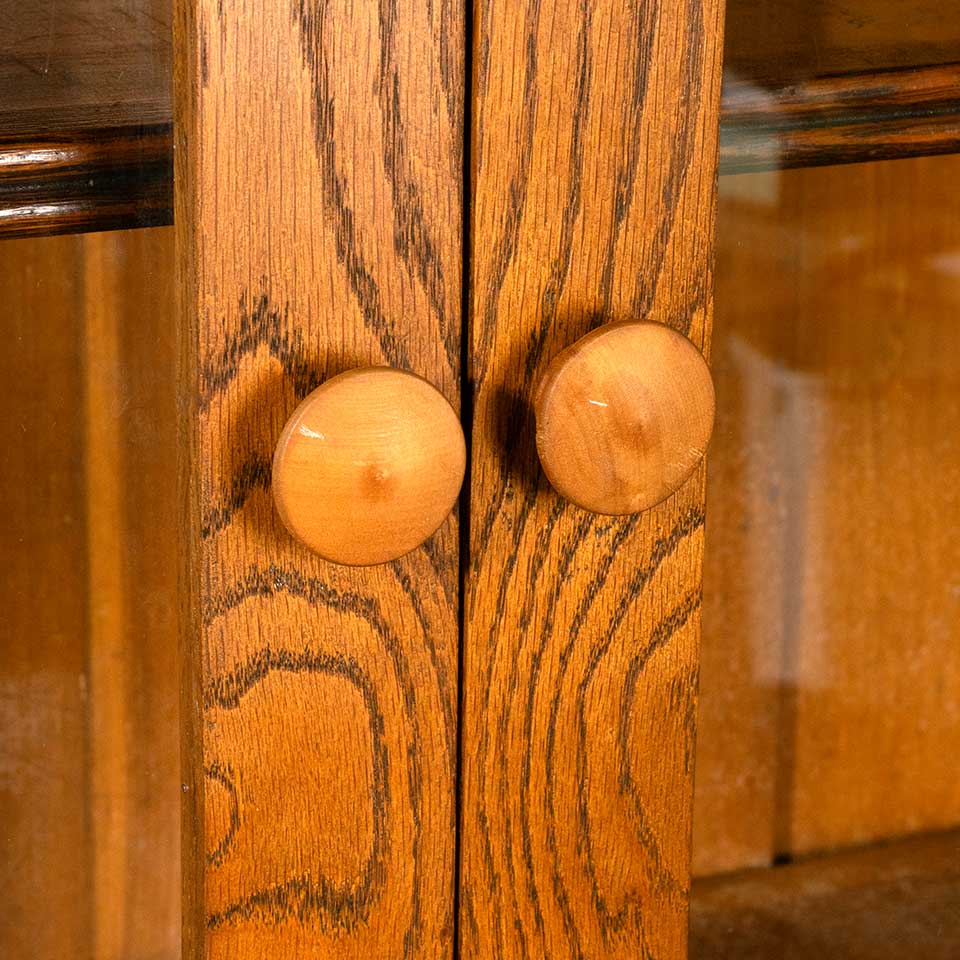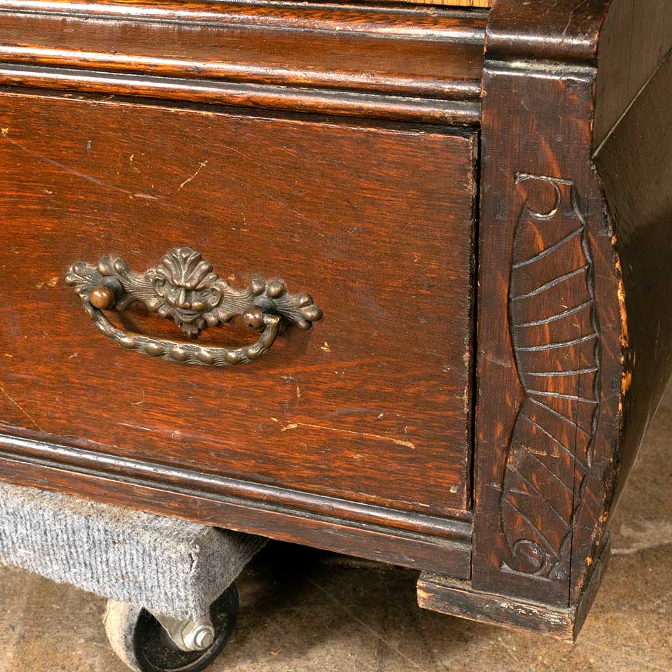 Antique oak two door bookcase with three adjustable shelves and a bottom drawer measuring approx. 41 34/" wide x 66 1/8" tall x 15 5/8" front to back. The doors appear to have been added at some point in the piece's history. See photos to evaluate condition.