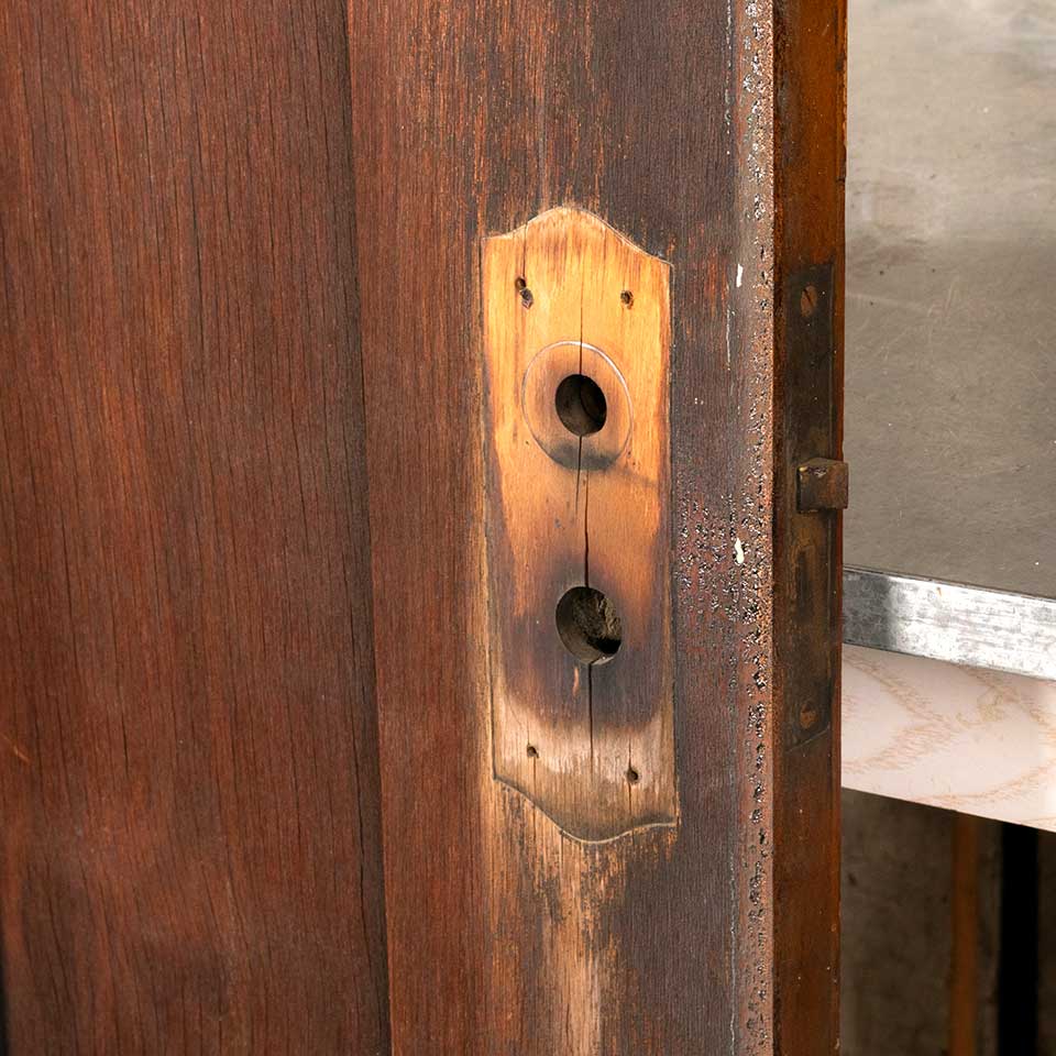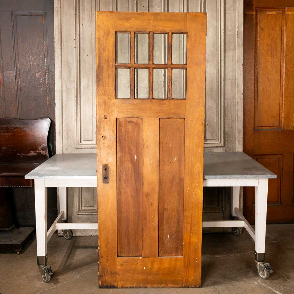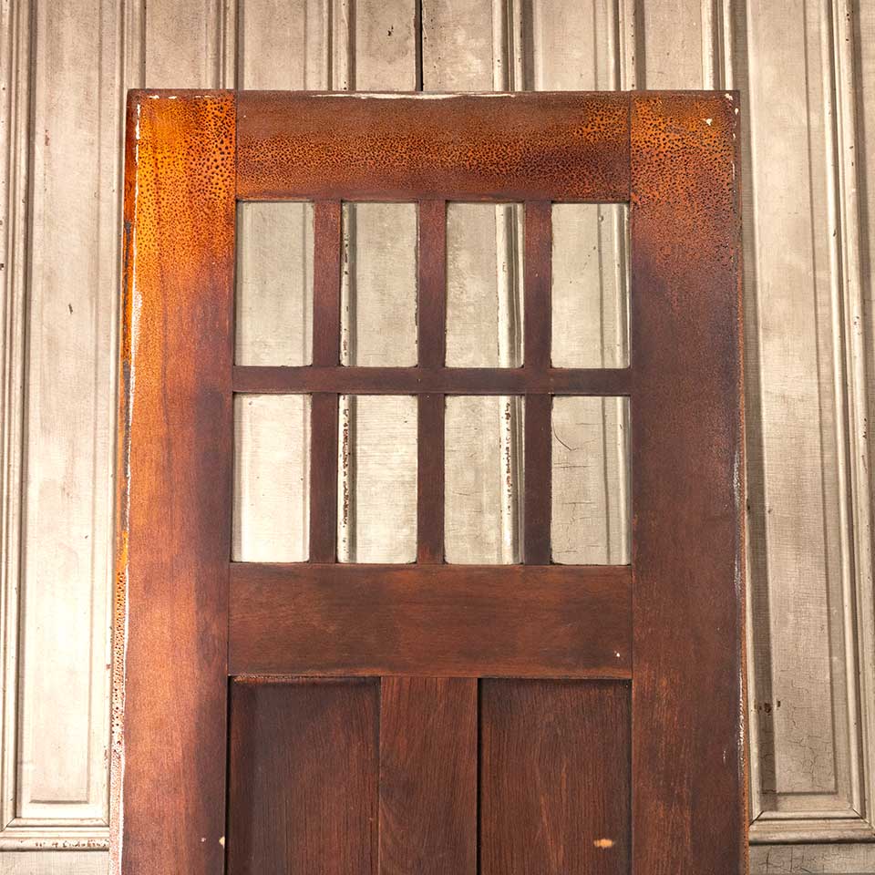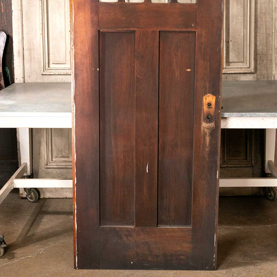 Architectural salvage antique Arts and Crafts eight lite wood entry door with mortise lock measuring approx. 30" wide x " 77 7/8" tall x 1 3/8" thick. The exterior panels are weathered. See photos to evaluate condition.