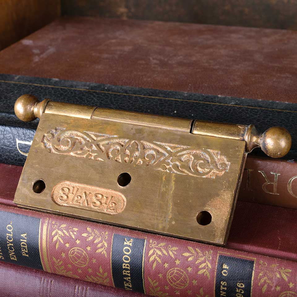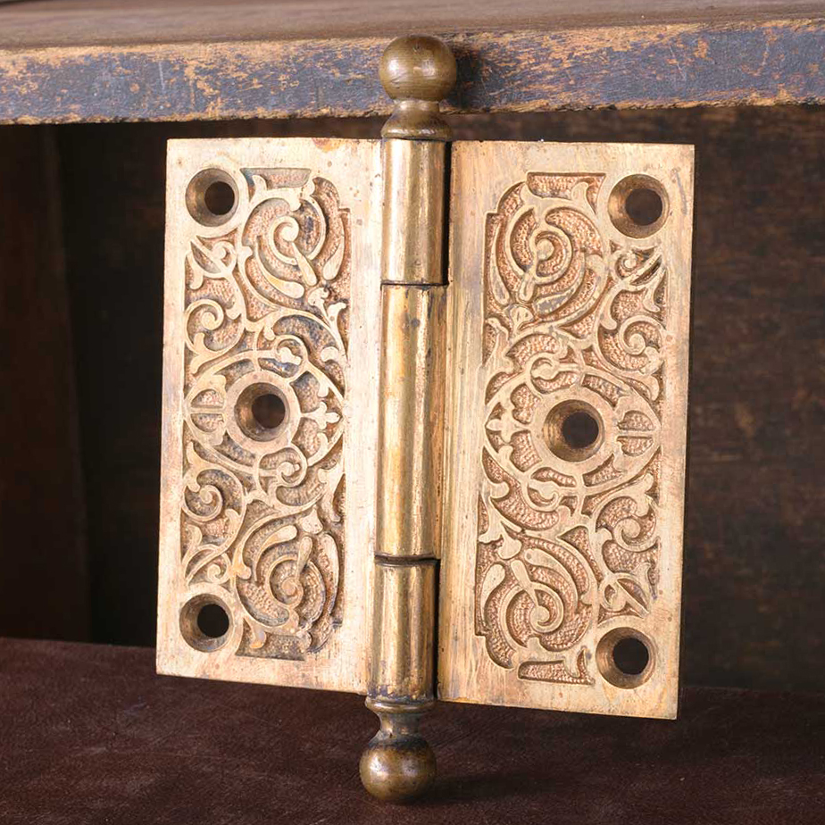 Architectural salvage antique ornate solid bronze door hinge hardware with ball finials measuring approx. 3 1/2" square (4 3/4" tall including finials). See photos to evaluate condition.