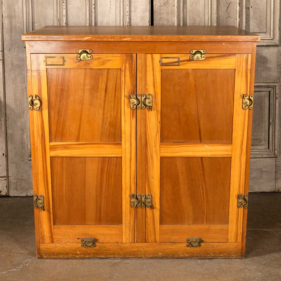 Architectural salvage vintage wood sample storage cabinet with removable fronts measuring approx. 38 5/8" wide x 40 1/8" tall x 23 1/4" front to back. There are no drawers included with this unit. See photos to evaluate condition.