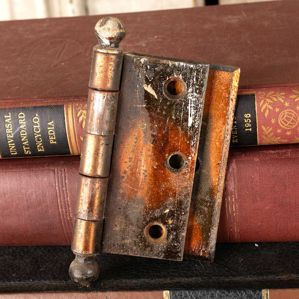 Architectural salvage antique steel ball finial off set door hinge hardware with a Japanned finish and beveled edge measuring approx. 4" wide x 3 1/2" tall (4 3/4" tall including finials). 10 are left hand & 10 are right hand. Color and condition vary, see photos to evaluate. Priced at $45/each.