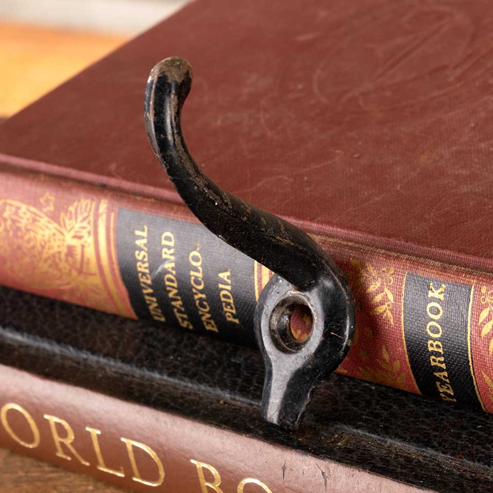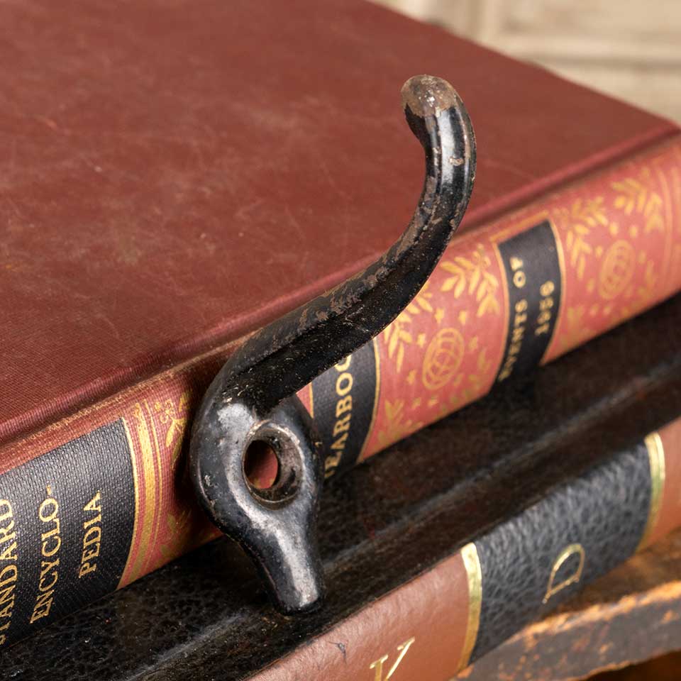 Architectural salvage antique petite cast iron wall mount closet coat / hat / clothes hook measuring approx. 7/8" wide x 2" tall x 2 1/4" front to back. Color and condition vary, see photos to evaluate. Priced at $3/each.