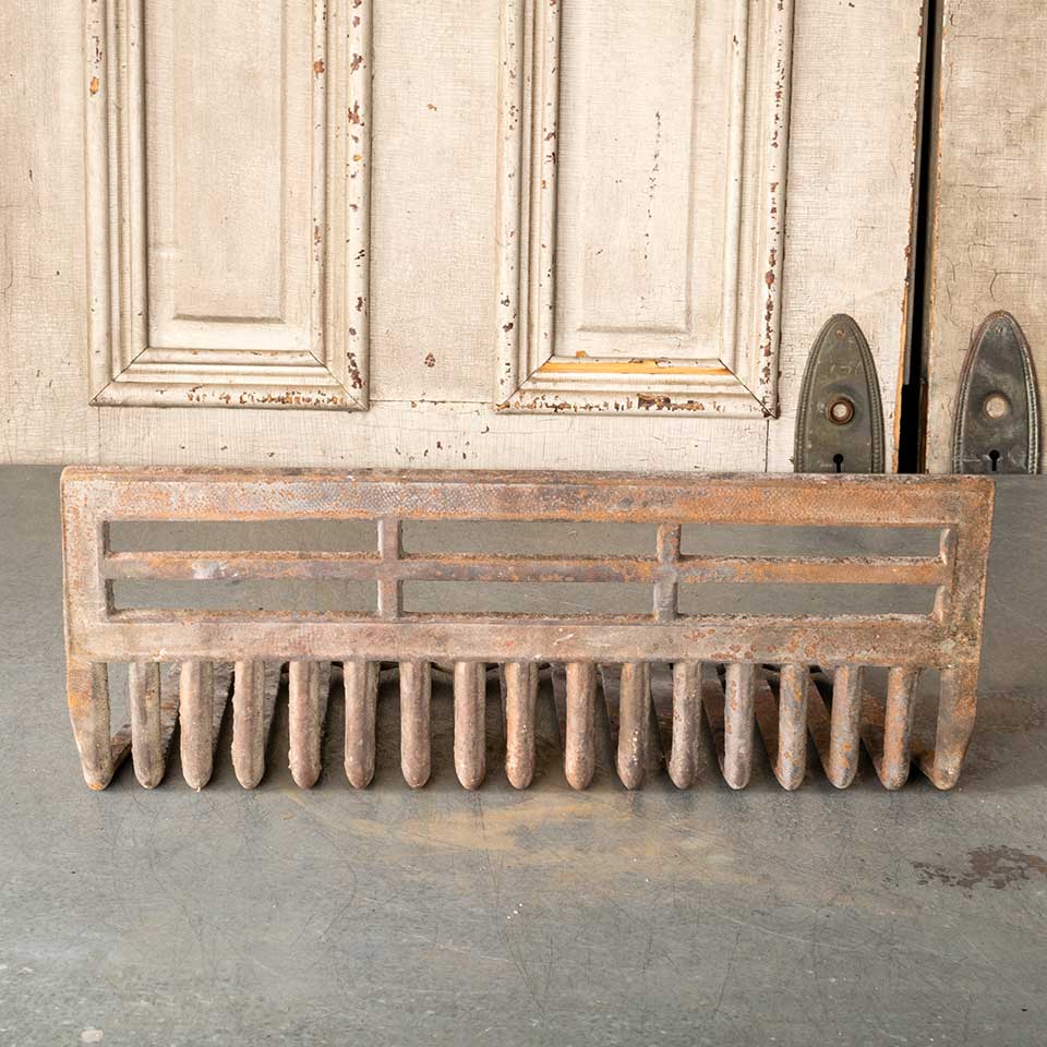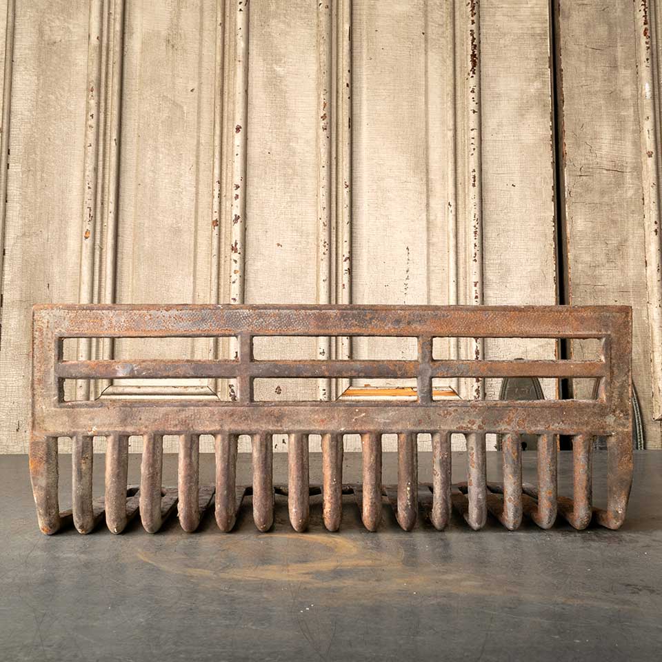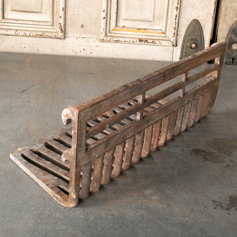 Architectural salvage antique cast iron hanging fireplace coal basket / log holder measuring approx. 19 3/4" wide x 7 5/8" tall x 8 1/4" front to back. See photos to evaluate condition.