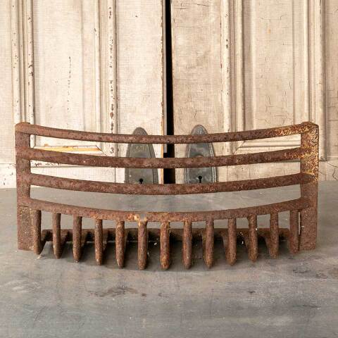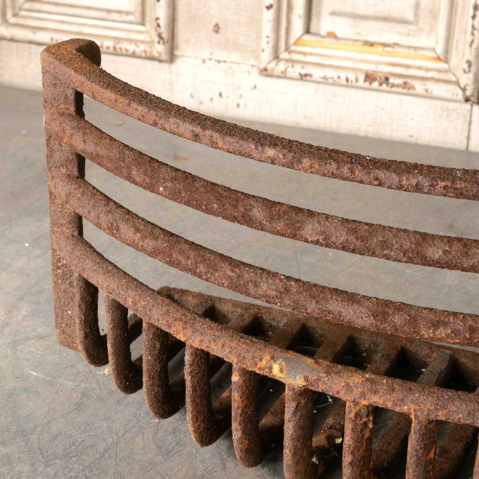 Architectural salvage antique cast iron hanging fireplace coal basket grate / log holder with curved front measuring approx. 20 1/2" wide x 9 3/8" tall x 8" front to back (overall dimensions). See photos to evaluate condition.