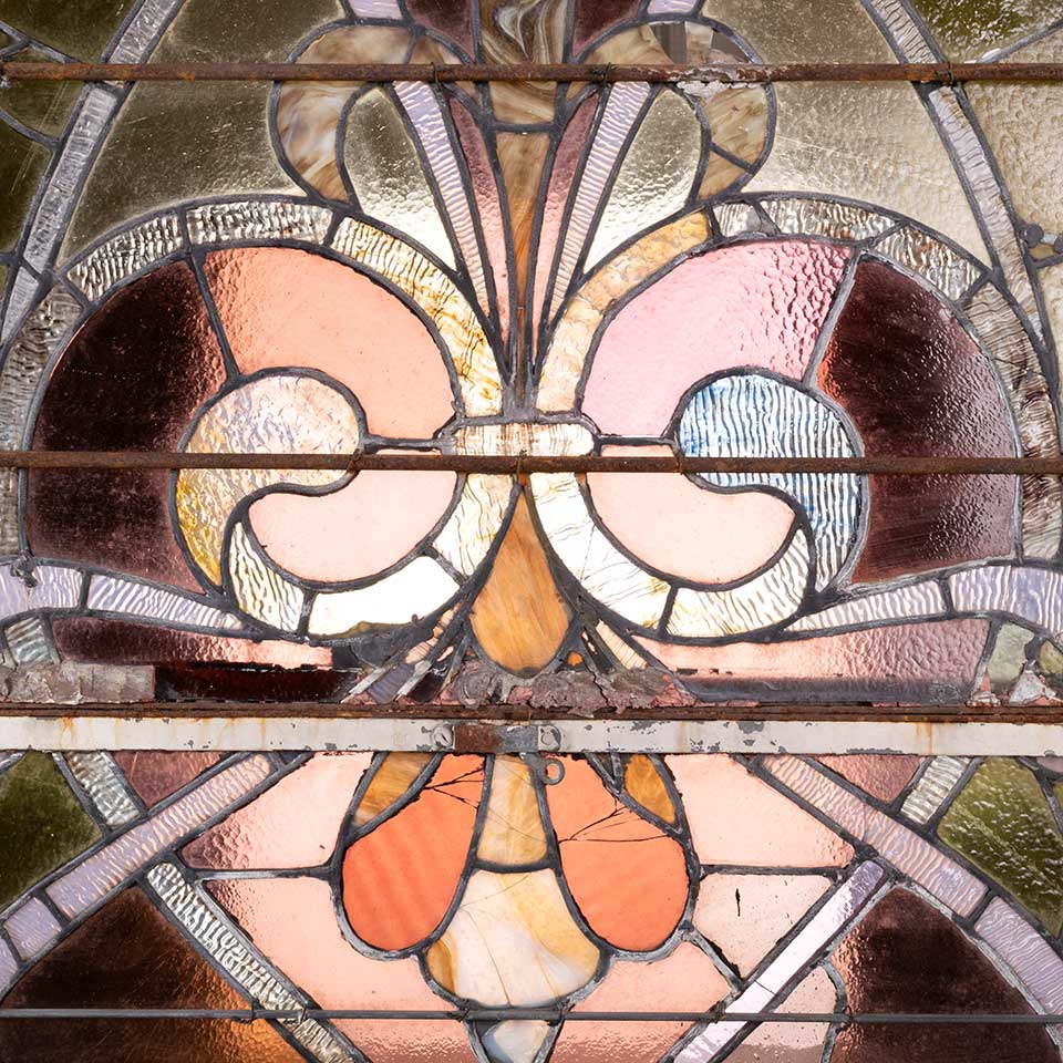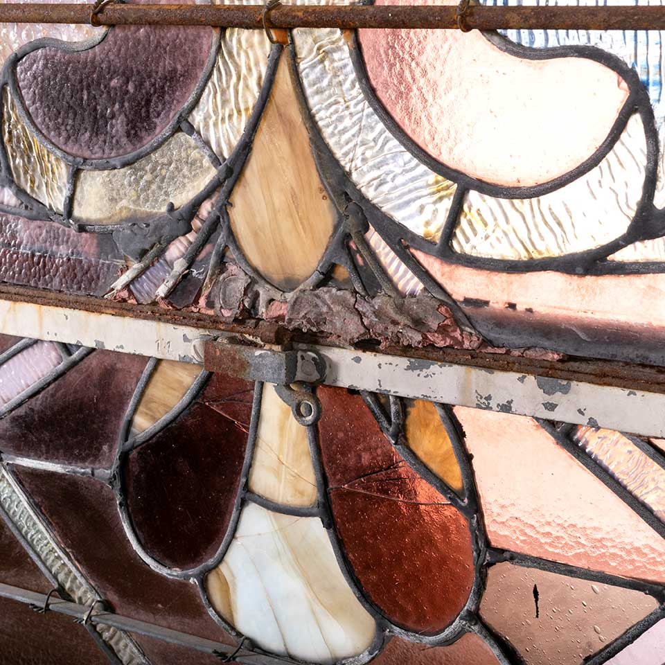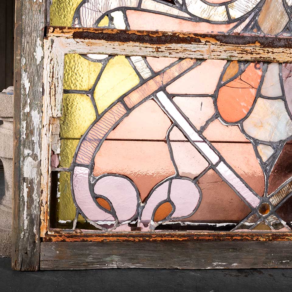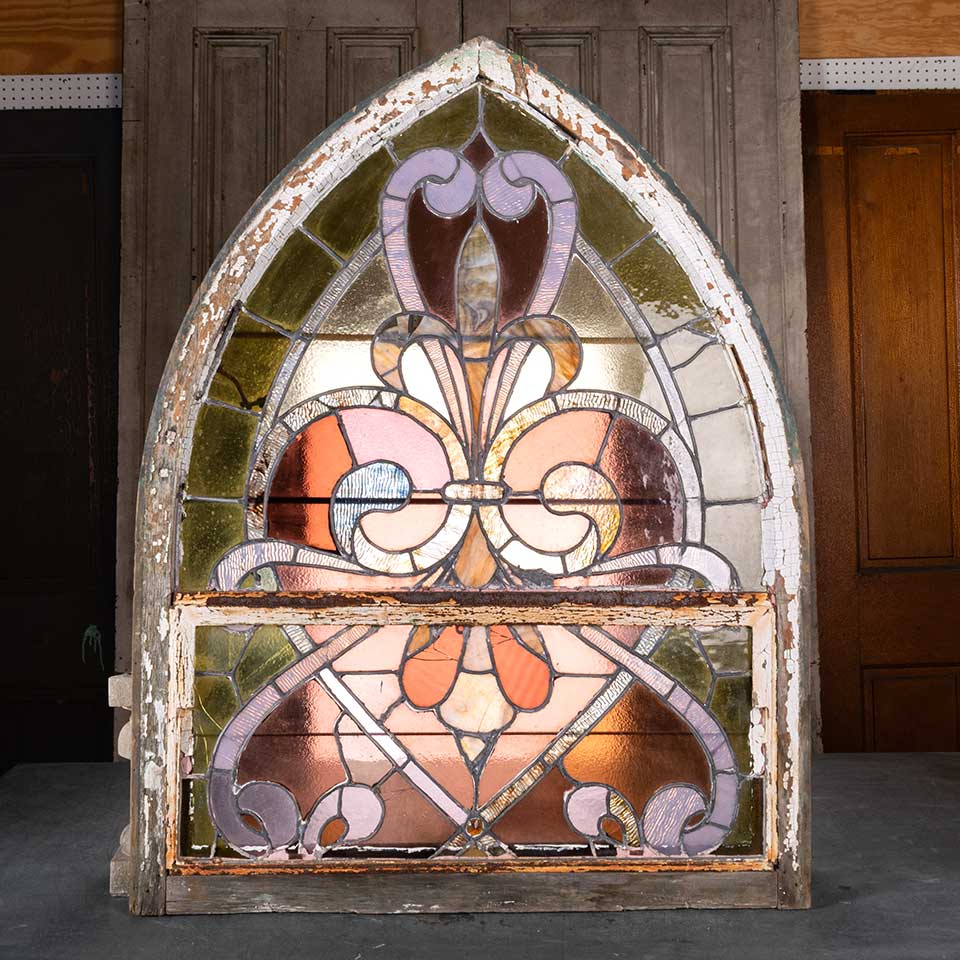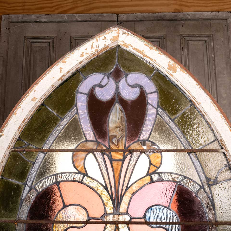 Architectural salvage antique pointed arch top wood framed stained glass window measuring approx. 3" wide x 46 1/2" tall x 1 3/4" front to back. There are cracked panes and some missing glass. See photos to evaluate condition.