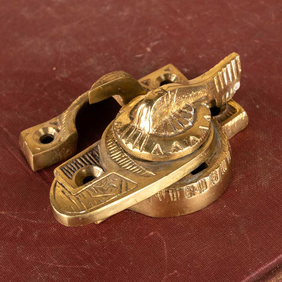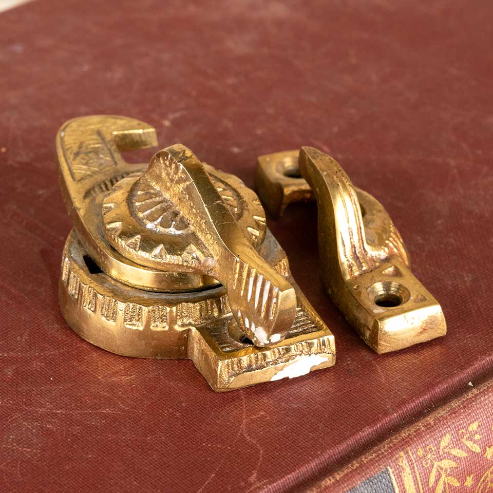 Architectural salvage Victorian style operable ornate brass double hung window sash lock and keeper hardware set. The lock measures approx. 2" wide x 1 1/4" tall x 1" front to back and the keeper 2" wide x 3/4" tall x 3/4" front to back. Color and condition may vary, see photos to evaluate. Priced at $40/each.