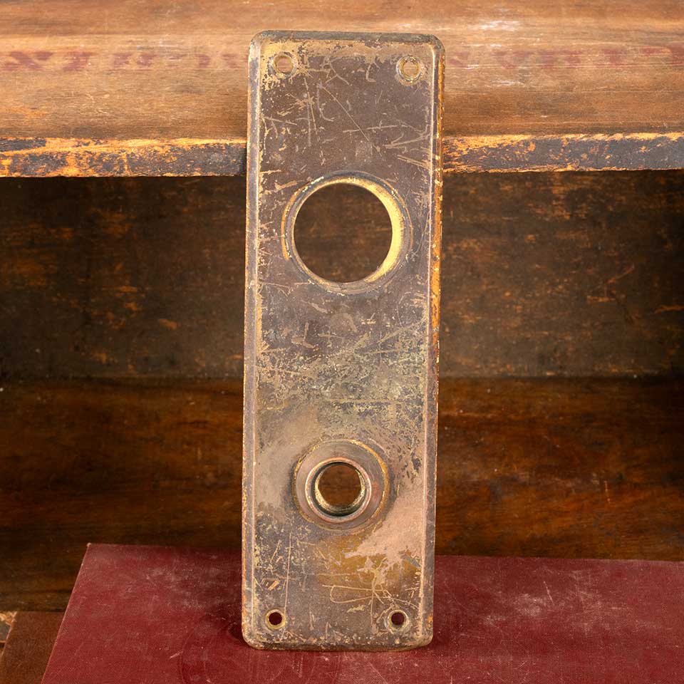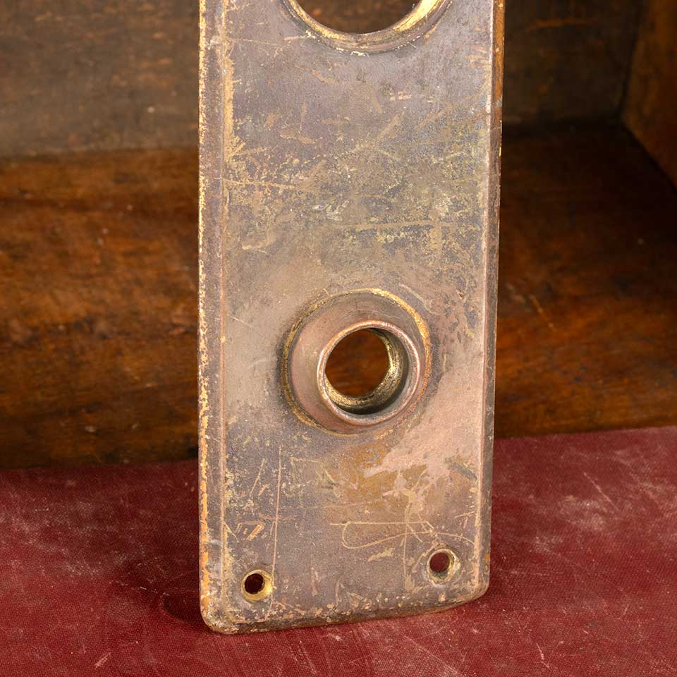 Architectural salvage antique brass entry doorknob backplate hardware with deadbolt cylinder lock hole measuring approx. 2 1/2" wide x 8" tall with a 3/4 collar. Distance between spindle hole and cylinder lock hole is 3 1/2" on center. Color and condition vary, see photos to evaluate. Priced at $25/each.