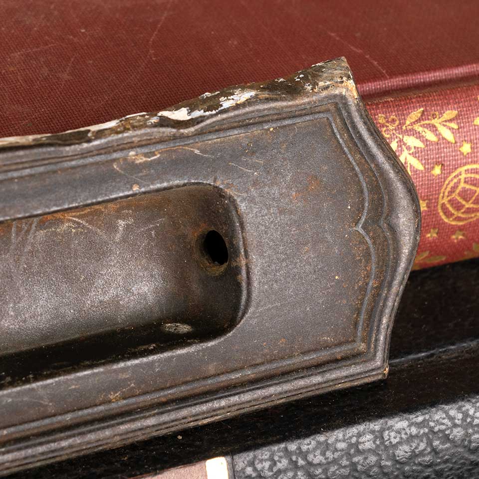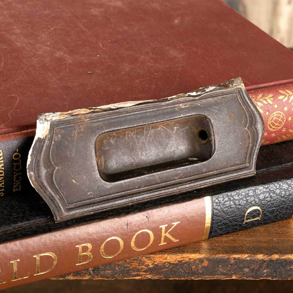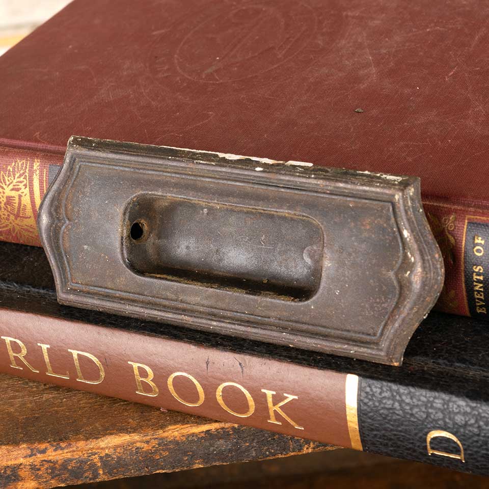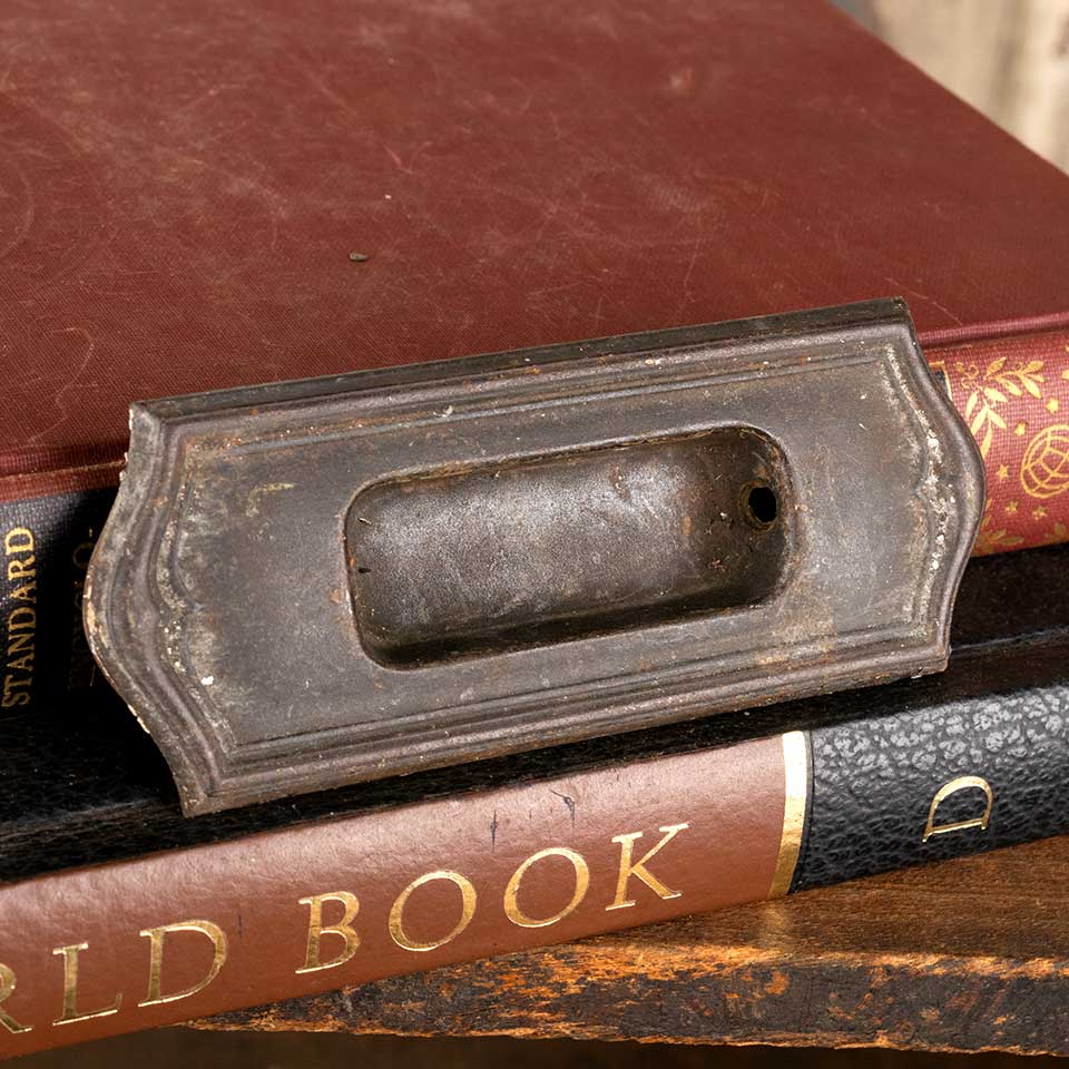 Architectural salvage antique metal Arts and Crafts window sash lift hardware measuring approx. 4" wide x 1 5/8" tall x 1/2" front to back. The recessed area measures approx. 2" wide x 3/4" tall. Color and condition may vary, see photos to evaluate. Priced at $30/each.